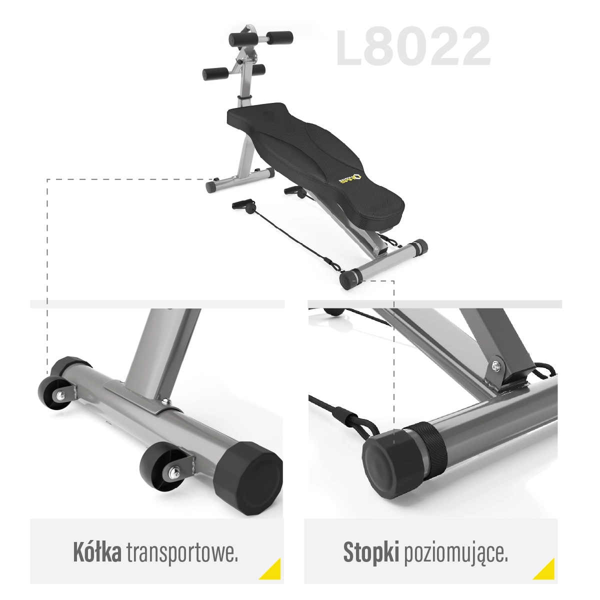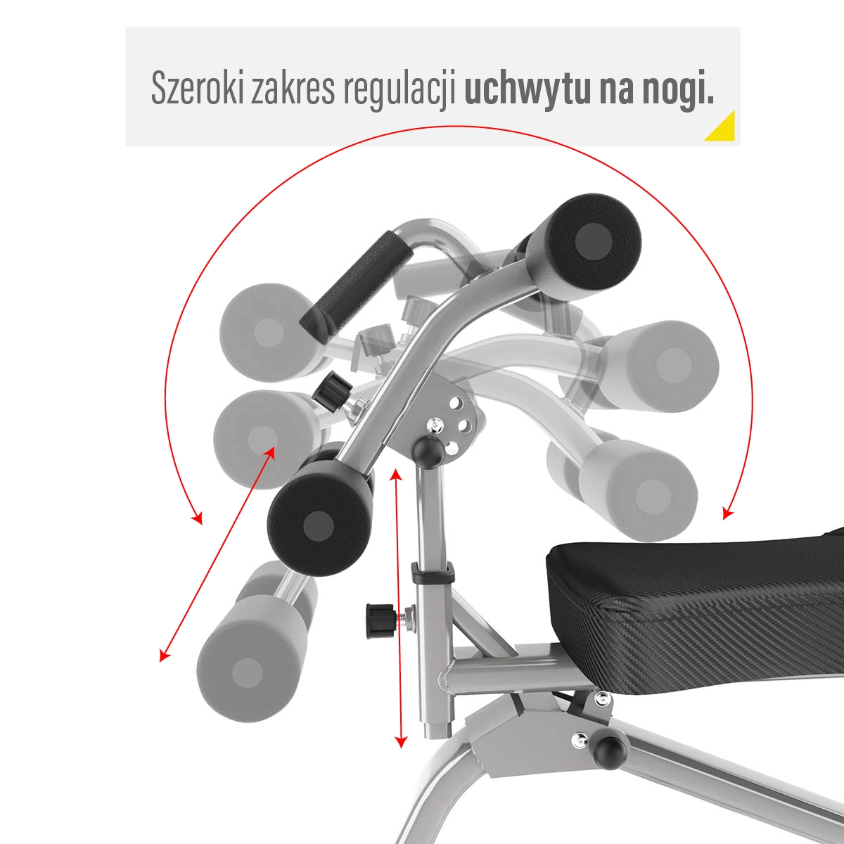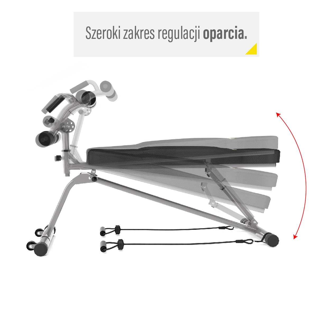 Izvlečni okvir z oporami omogoča natančno prilagoditev vaši postavi – nastaviti je mogoče kot v 4 položajih, višino v 3 položajih in oporni valj za noge v 3 razdaljah. Ergonomsko oblazinjenje iz umetnega usnja s karbonskim videzom je odporno na znoj in zmanjšuje drsenje. Dva priložena raztezna trakova razširjata možnosti treninga z osnovnimi vlečnimi in potisnimi vajami, medtem ko transportna kolesca olajšajo premikanje.