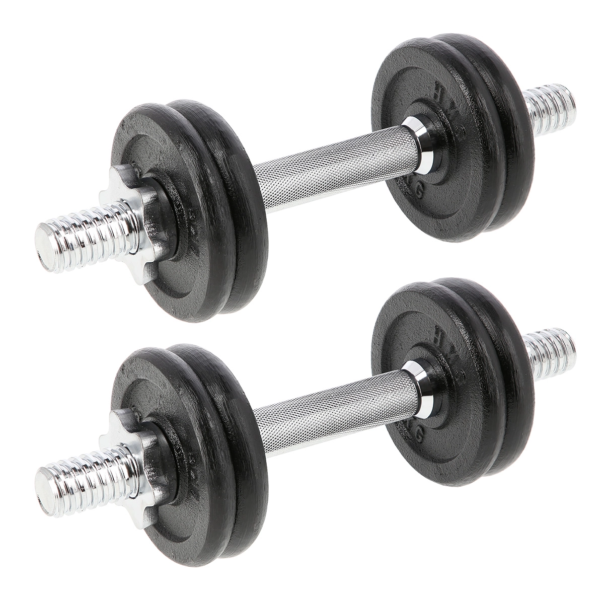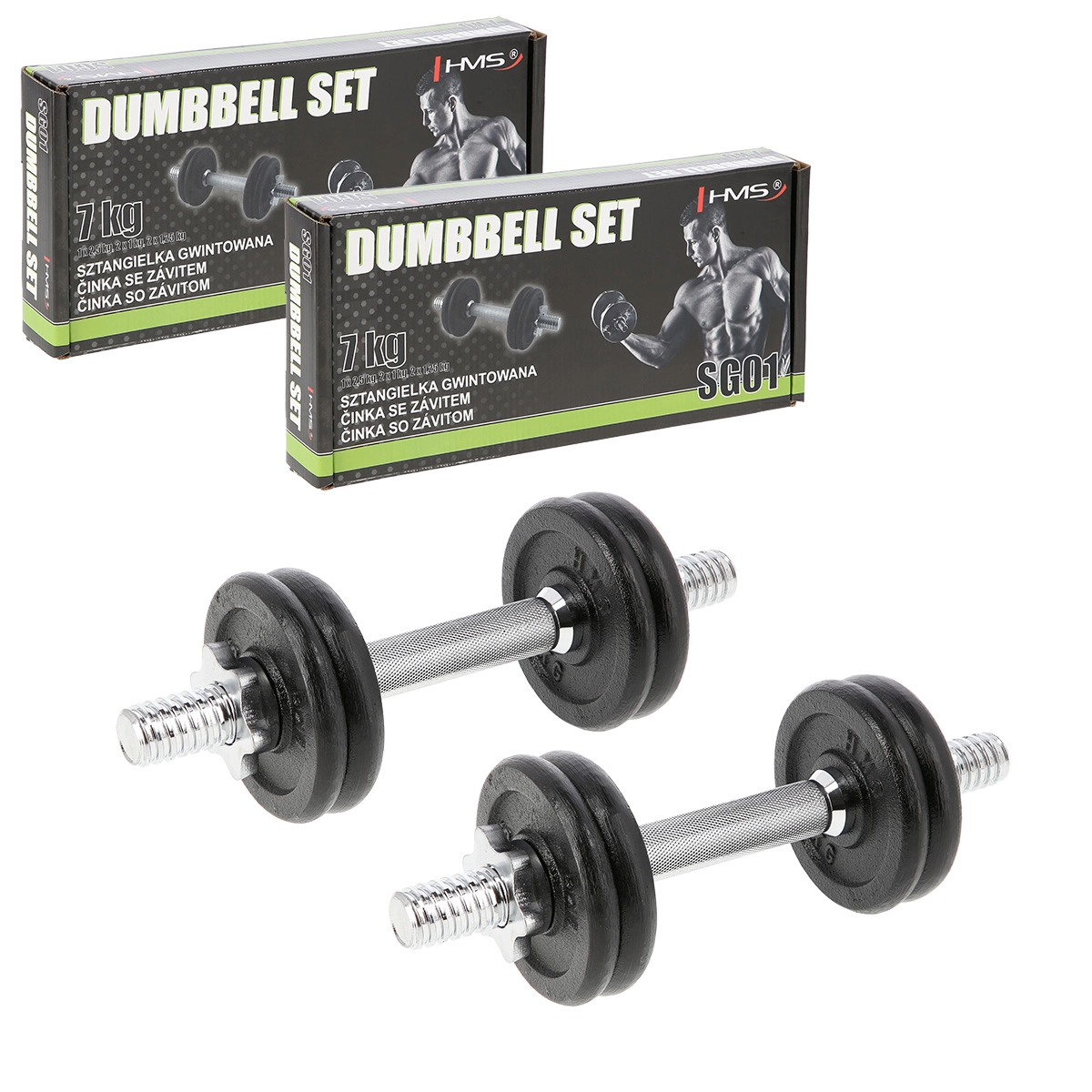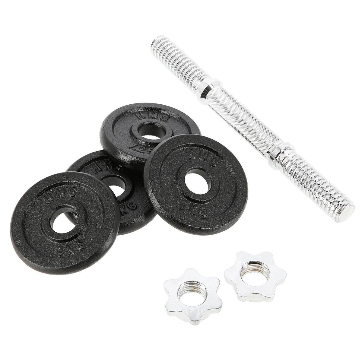 Komplet vključuje 2 ravni jekleni osi (nikeljano jeklo), litoželezne kolute in zvezdasta zapirala za hitro in varno menjavo obremenitve. Rebrast ročaj zagotavlja trden oprijem tudi pri intenzivnih serijah, medtem ko navoji s zapirali zanesljivo držijo kolute na mestu. Gre za univerzalno rešitev za upogibe za biceps, triceps, rame in zgornji del hrbta.
