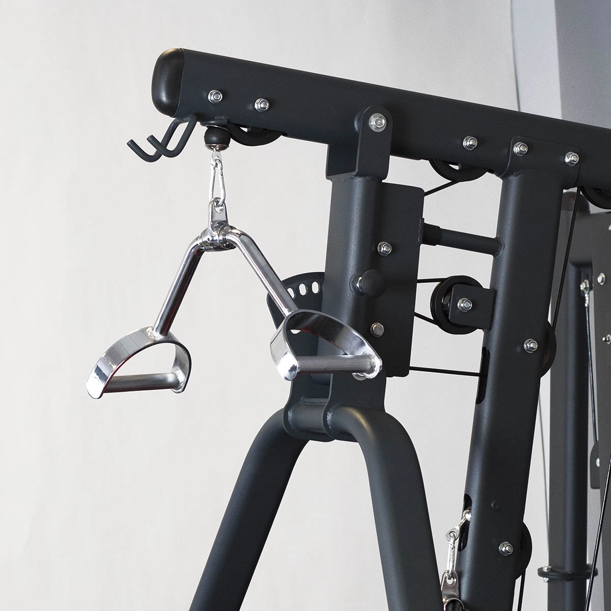 Popolnoma kovinska konstrukcija s protizdrsnim rebrastim vzorcem na ročajih nudi odličen nadzor tudi pri večjih obremenitvah. Univerzalno pritrdilno uho je združljivo z običajnimi škripčnimi sistemi, zato adapter zlahka vključite v domači ali komercialni fitnes.