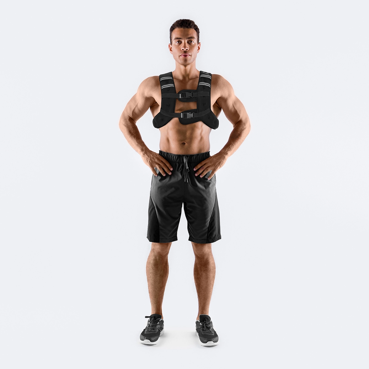 Nastavljivi ramenski trakovi in sprednje hitre zaponke držijo telovnik trdno na mestu tudi pri dinamičnih gibih.