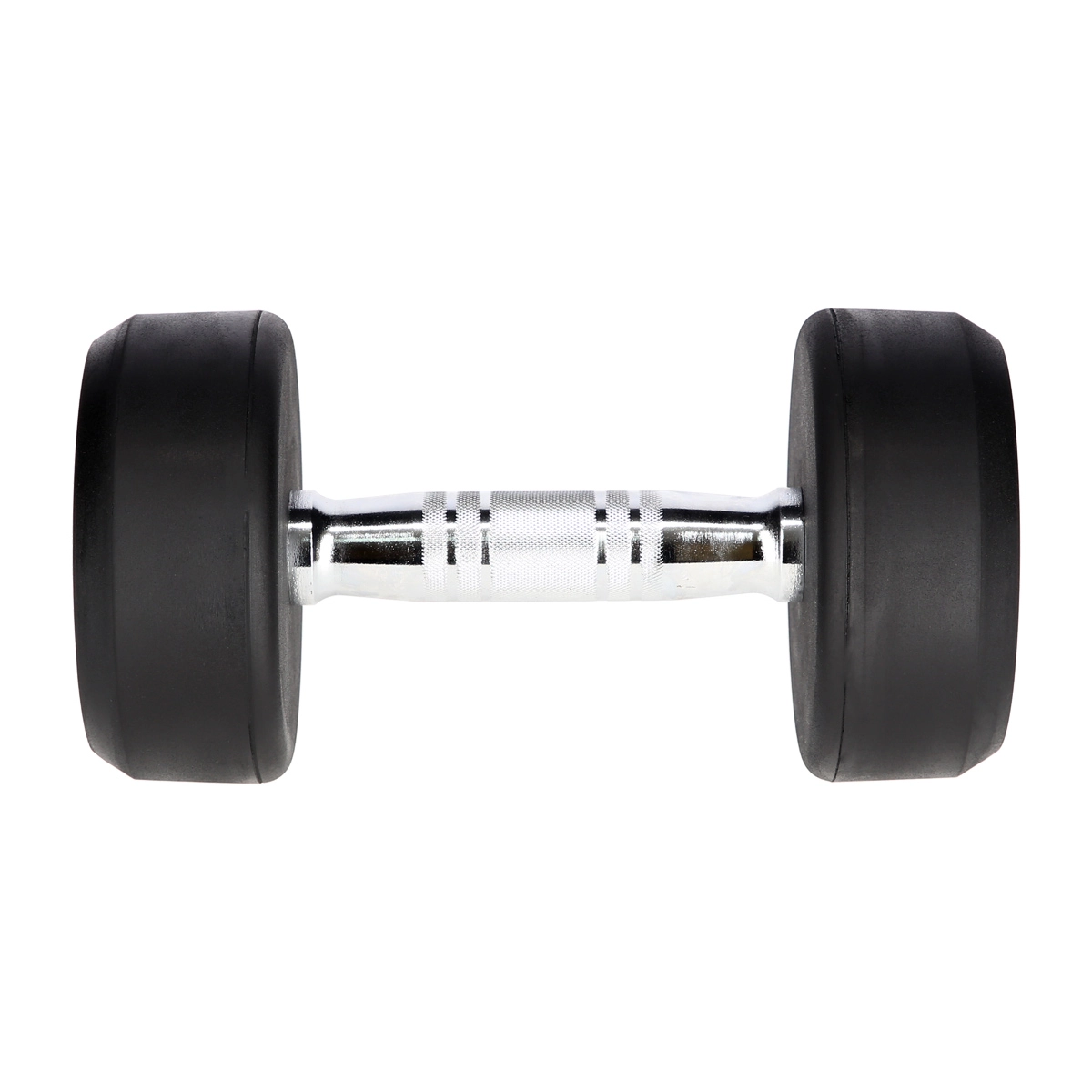 Litoželezne glave, prevlečene z debelo plastjo gume, ščitijo utež in tla, blažijo udarce ter zmanjšujejo hrup pri odlaganju.