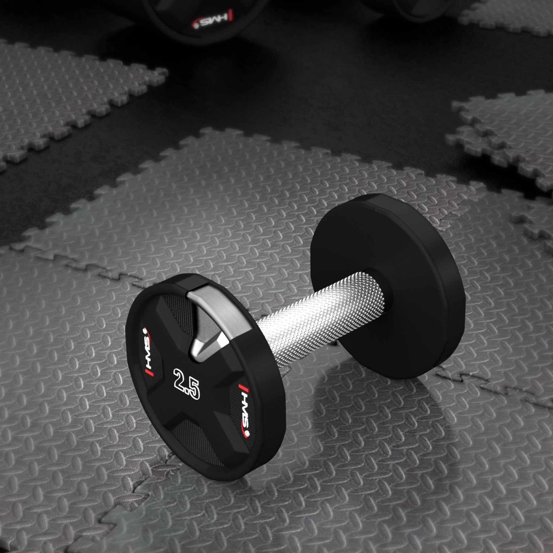 Vzdržljiva enoročna utež HMS HPC 2,5 kg z jeklenim jedrom in litim poliuretanskim premazom ponuja vrhunsko življenjsko dobo, varen protizdrsen oprijem in moderen dizajn za intenziven vadbeni trening doma in v fitnesu.