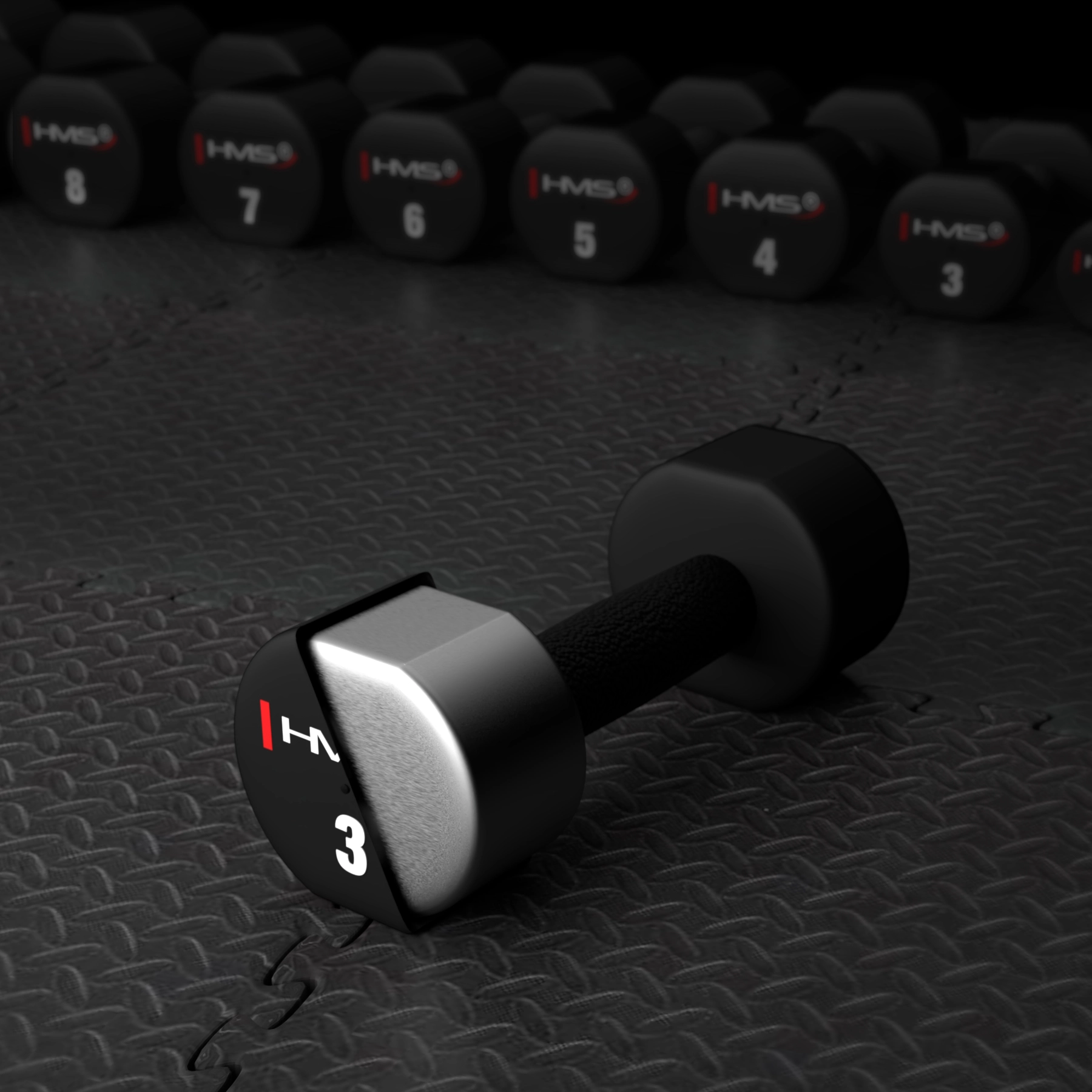 Ročke HMS HPT03 združujejo čvrsto jekleno jedro s termoplastičnim poliuretanom (TPU), ki je prožen, trpežen in brez vonja. Površina blaži udarce, ščiti tla in zmanjšuje hrup, zato se lahko osredotočite na izvedbo. Jasna oznaka teže omogoča hiter izbor.