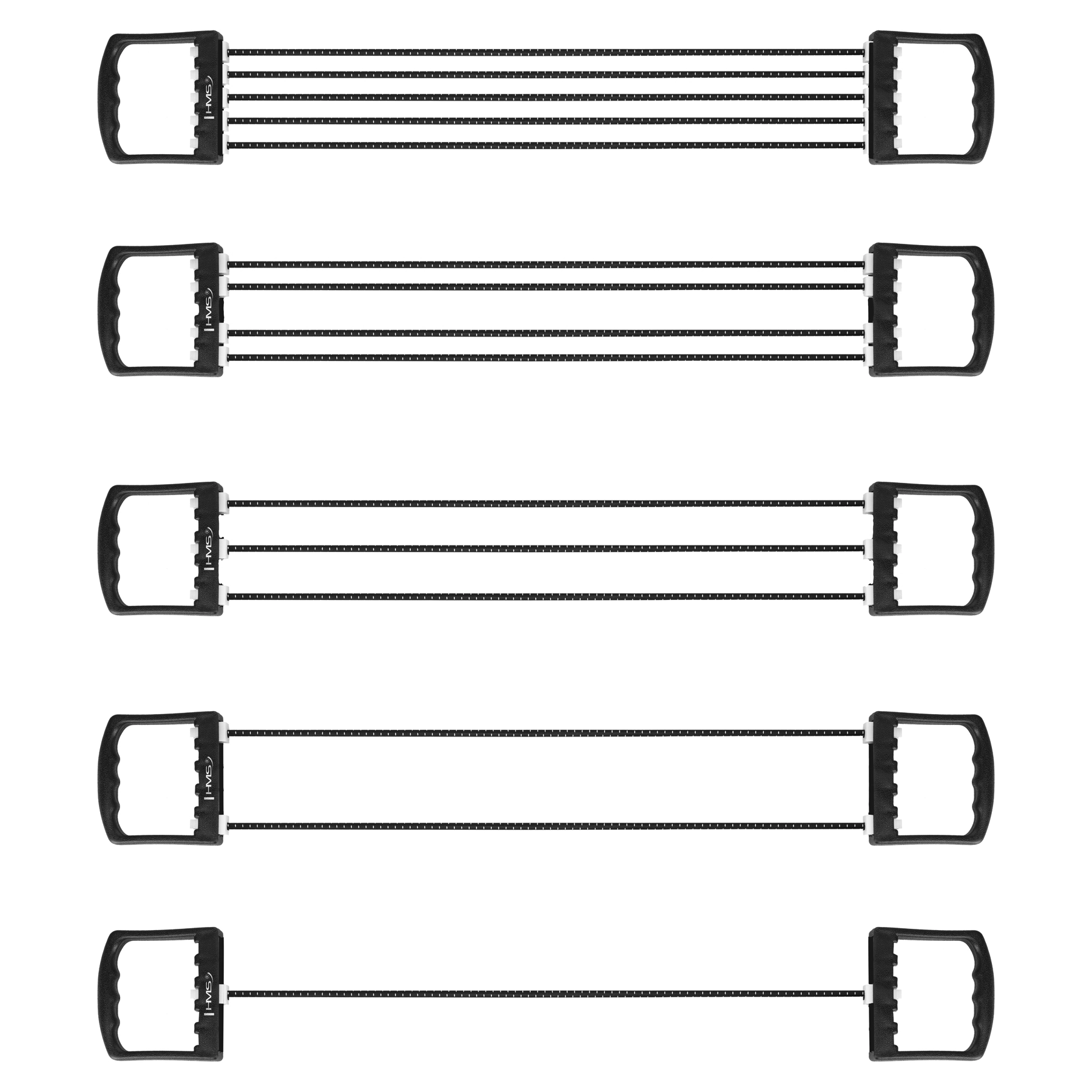 Univerzalni gumijasti ekspander HMS s petimi zamenljivimi strunami za vadbo zgornjega dela telesa. Z možnostjo odstranjevanja ali dodajanja strun preprosto nastavite spremenljiv upor za krepitev rok, hrbta in prsnega koša ter tudi za rehabilitacijske vaje. Ergonomični nedrseči ročaji iz trpežne plastike zagotavljajo zanesljiv oprijem in udobje pri vadbi doma ali na poti.