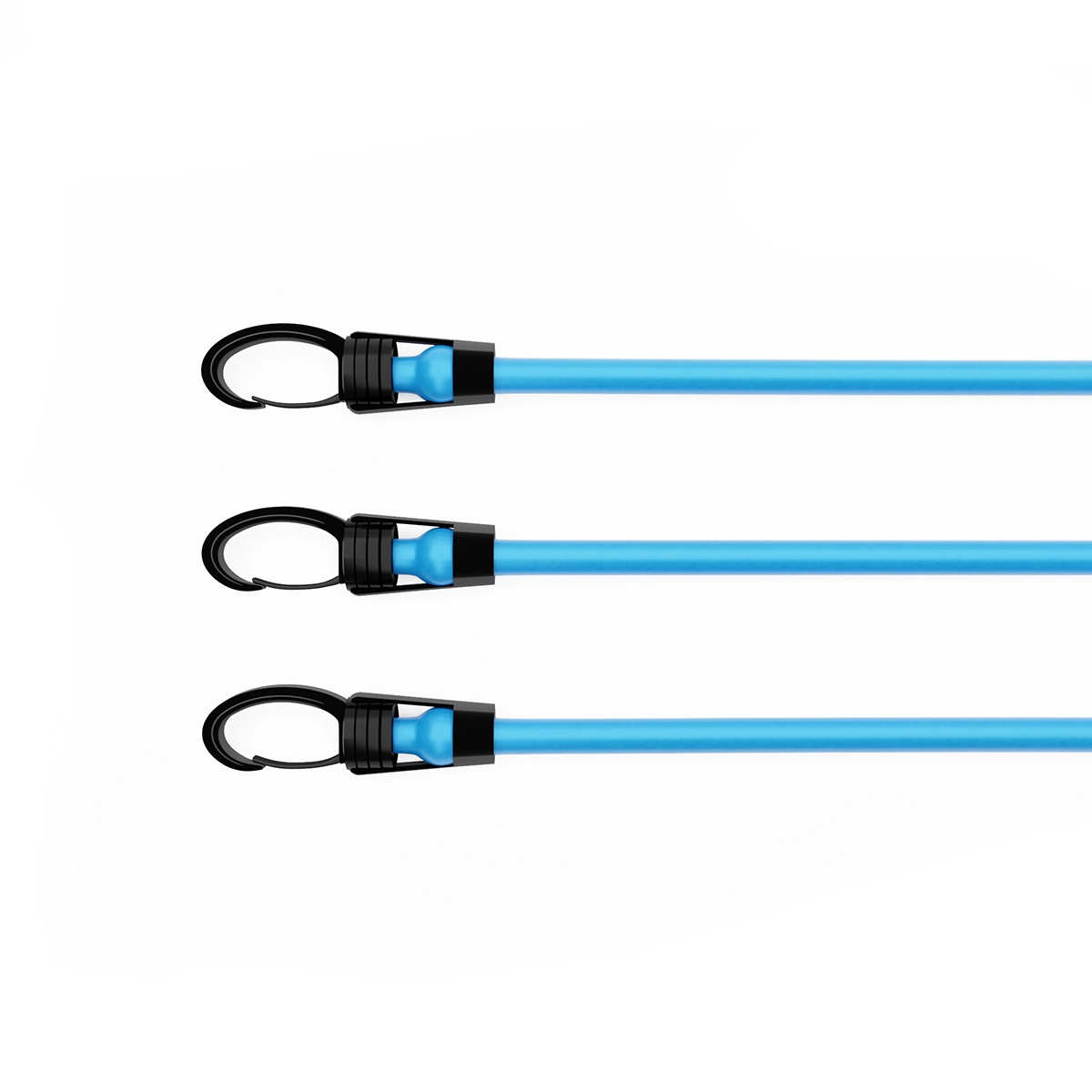 Vzdržljive gume z različnimi stopnjami upora omogočajo natančno stopnjevanje zahtevnosti – upor lahko povečate tudi s kombinacijo več gum hkrati. Peneči ročaji zagotavljajo zanesljiv in udoben oprijem, medtem ko trakovi za gležnje razširijo nabor vaj za zadnjico in stegna. Karabini omogočajo hitro menjavo dodatkov in tekoče prehode med vajami.