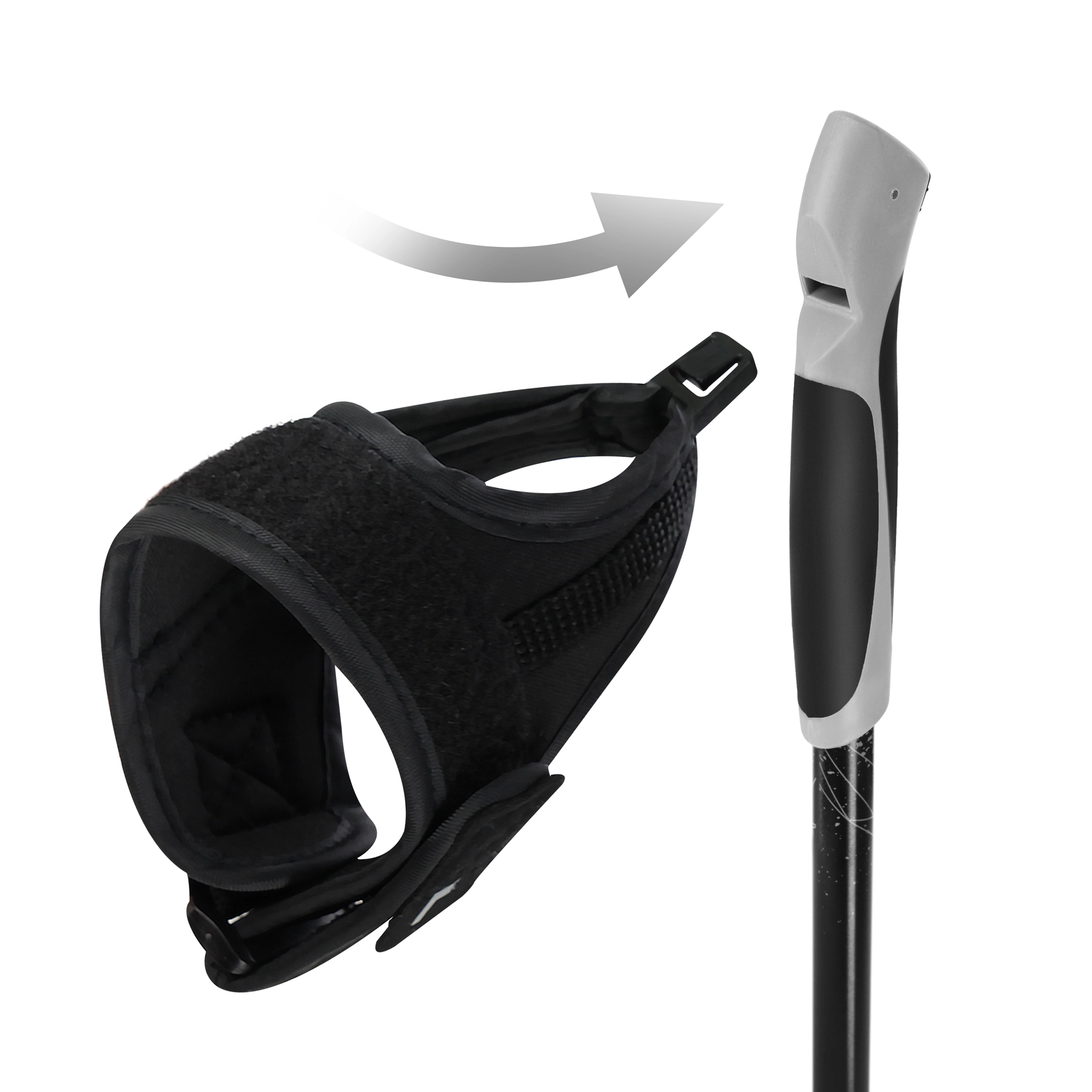 Ergonomski ročaji iz plastike in TPE s protizdrsno površino ter nastavljivimi paščki zagotavljajo zanesljiv oprijem tudi pri daljših sprehodih. V paketu najdete dva kompleta krpic za različne razmere in praktičen transportni etui za enostavno prenašanje.