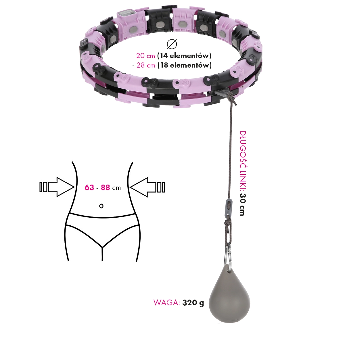 V enem izmed delov je nameščen zaslon števca, ki spremlja število obratov, tako da imate pregled nad potekom vadbe. Redna uporaba pomaga zožati trebuh in pas, učvrstiti stegna in zadnjico ter izboljšati kardio kondicijo. Obruč je izdelan iz trpežnih materialov PVC in ABS za dolgo življenjsko dobo.