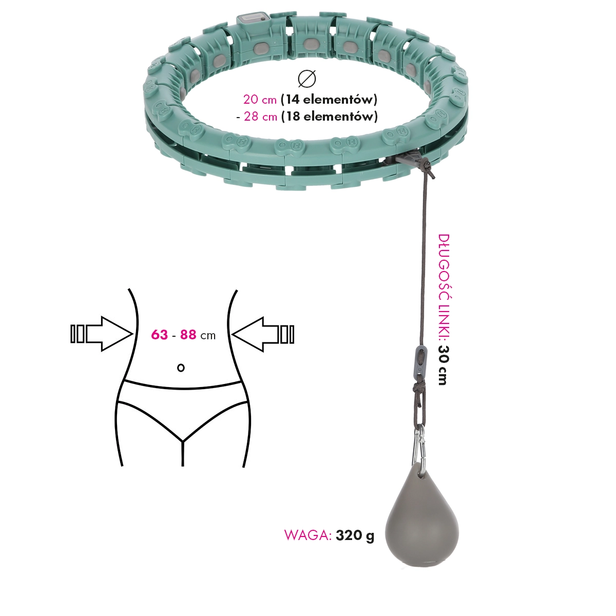 Pametni masažni hula hoop je sestavljen iz modularnih členov, ki jih preprosto zaskočite glede na svoj obseg pasu. Notranje masažne izbokline prijetno stimulirajo predel trebuha in bokov ter hkrati dušijo vibracije. Zahvaljujoč vrteči se uteži na ležajih dobite gladko gibanje in višjo učinkovitost treninga, ki jo določate s hitrostjo kroženja in dolžino vrvice.