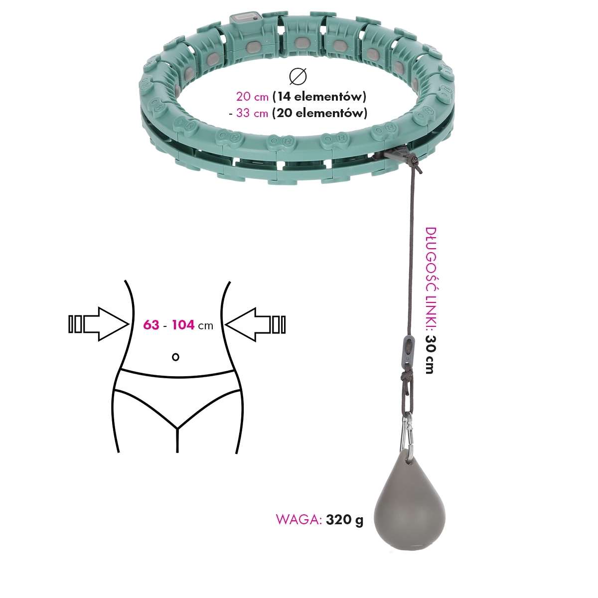 Obroč sestavite iz do 20 zaskočnih delov in ga prilagodite obsegu pasu 63–104 cm. Ostane na mestu in ne drsi čez boke.
