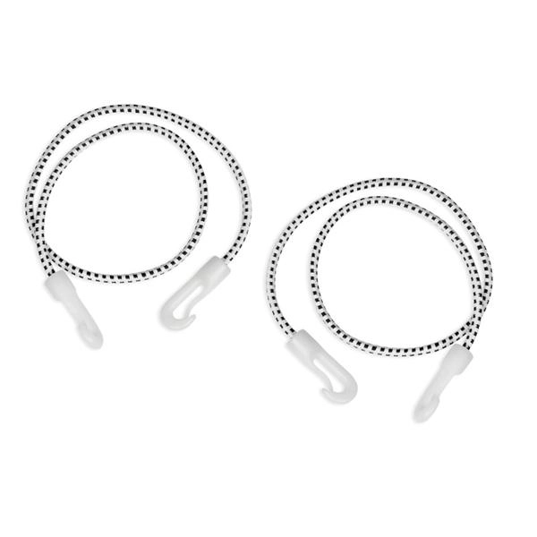 Dve montažni elastiki s karabinami iz utrjene plastike za hitro pritrditev med tla in strop v prostorih z višino 180–300 cm.