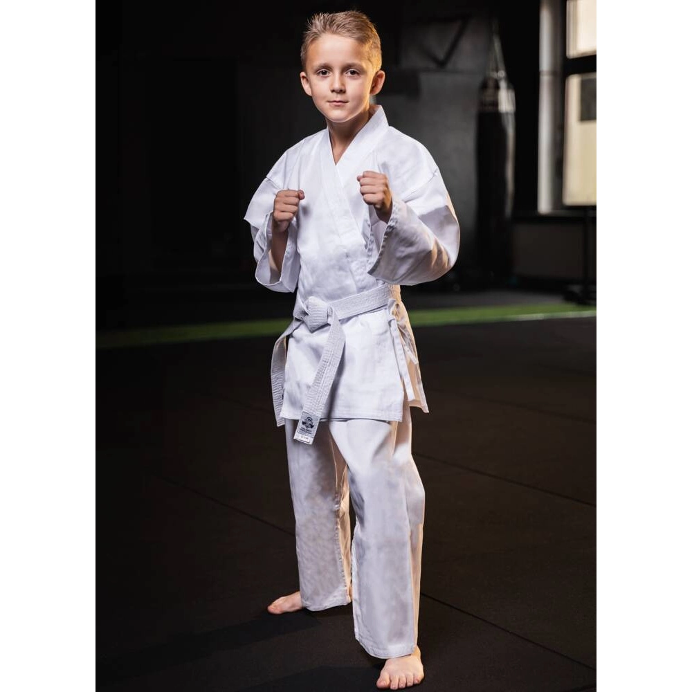 Praktičen kroj in dvojno pritrjevanje hlač (elastika + vrvica) preprečujeta drsenje in omogočata otrokom, da se osredotočijo le na tehniko. Del kompleta je tudi bel pas dolžine 210 cm, zato nič ne ovira takojšnjega začetka treninga.