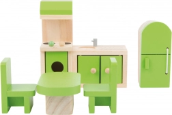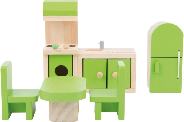 Ta podrobno izdelan kuhinjski komplet za hiške ponuja vse, kar mali kuharji potrebujejo – umivalnik, štedilnik, hladilnik, mizo in dva stolčka v prijetni kombinaciji naravnega lesa in svežih zelenih poudarkov. Zaradi masivnega lesa je pohištvo stabilno in pripravljeno na vsakodnevno igro.