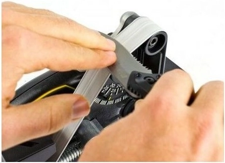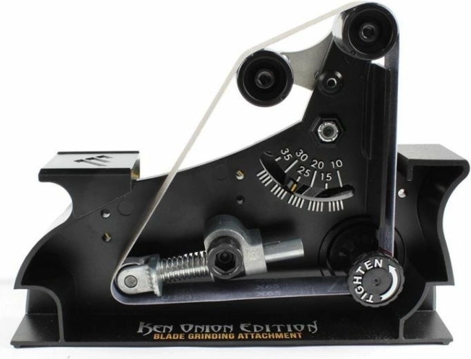 Robustna kovinska konstrukcija, gladki vodilni koluti in kotno vodilo zagotavljajo konsistentne rezultate in ponovljivost. Večja kontaktna površina traku pomaga ustvarjati enakomerne fazete in gladek brus tako pri kuhinjskih kot pri outdoor in delovnih nožih.