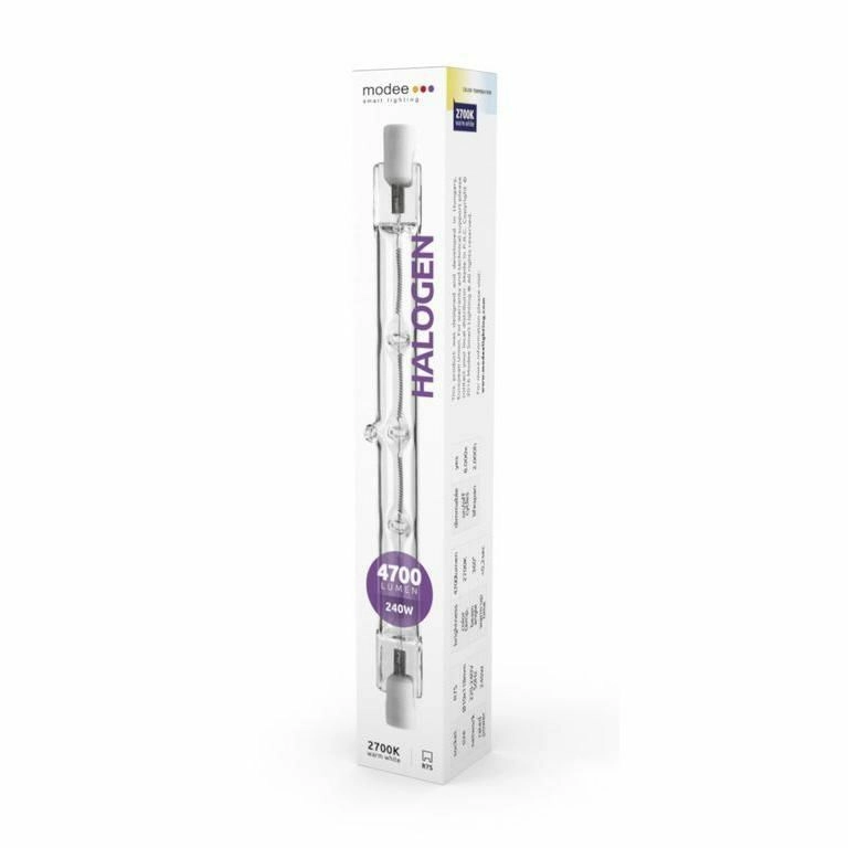 Halogenska žarnica MODEE R7S 118 mm 240 W iz serije ECO ponuja takojšen poln sij, zatemnljiv svetlobni tok in toplo belo svetlobo 2700 K. Zahvaljujoč visokemu svetlobnemu izkoristku 4700 lm in kotu sevanja 360° odlično osvetli notranje in zunanje prostore. Poseben notranji premaz odbija infrardeče sevanje za višjo učinkovitost.