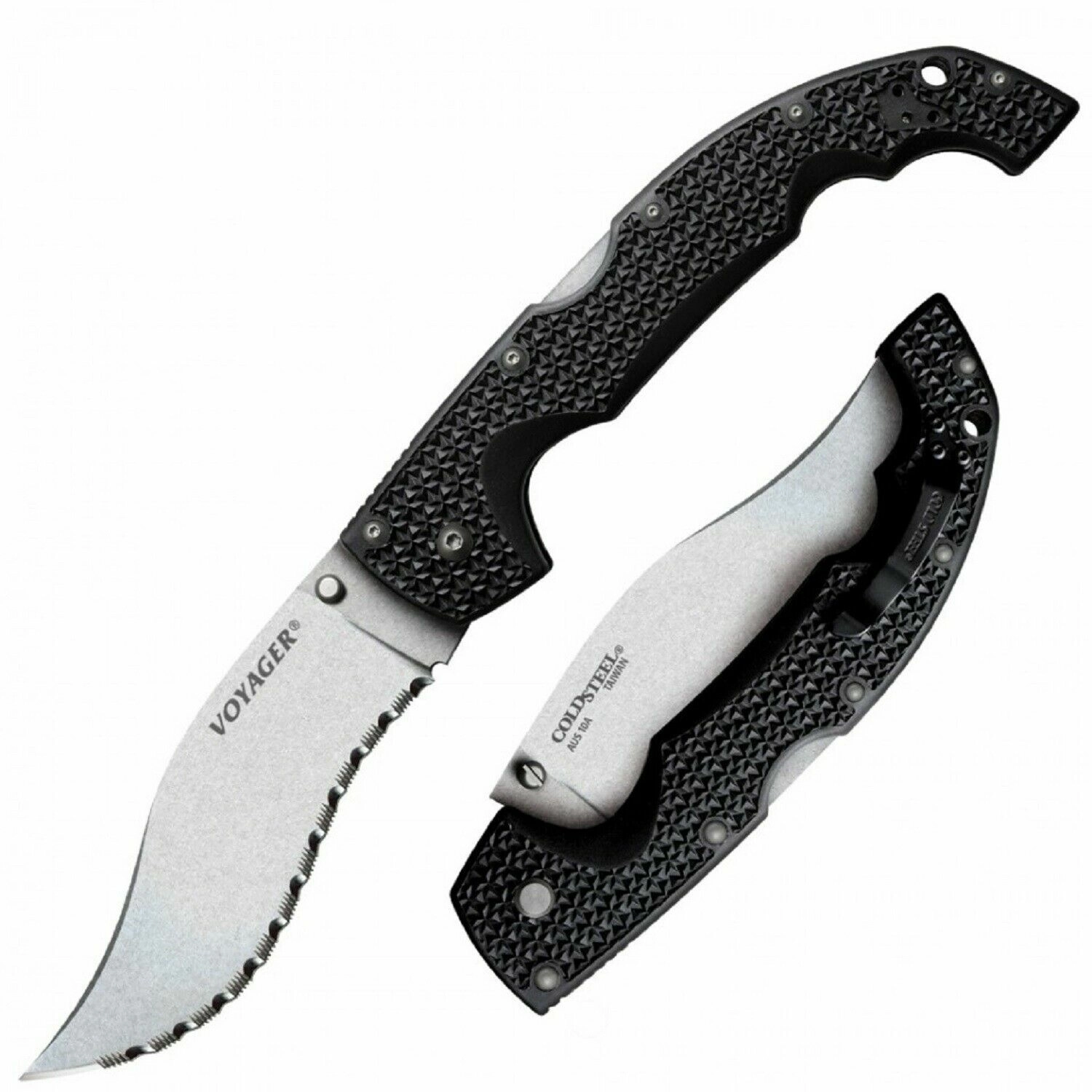 Cold Steel Extra Large Voyager Vaquero Serrated je robusten, a hkrati lahek zložljivi nož z agresivno obliko rezila Vaquero, ki izstopa pri rezanju in sekaniu. Zahvaljujoč nazobčanemu robu in vzdržljivemu jeklu AUS10A zlahka obvlada trše materiale ter dolgoročno ohranja ostro rezilo. Površina Stonewash zmanjšuje vidnost prask in povečuje odpornost pri vsakodnevni uporabi.