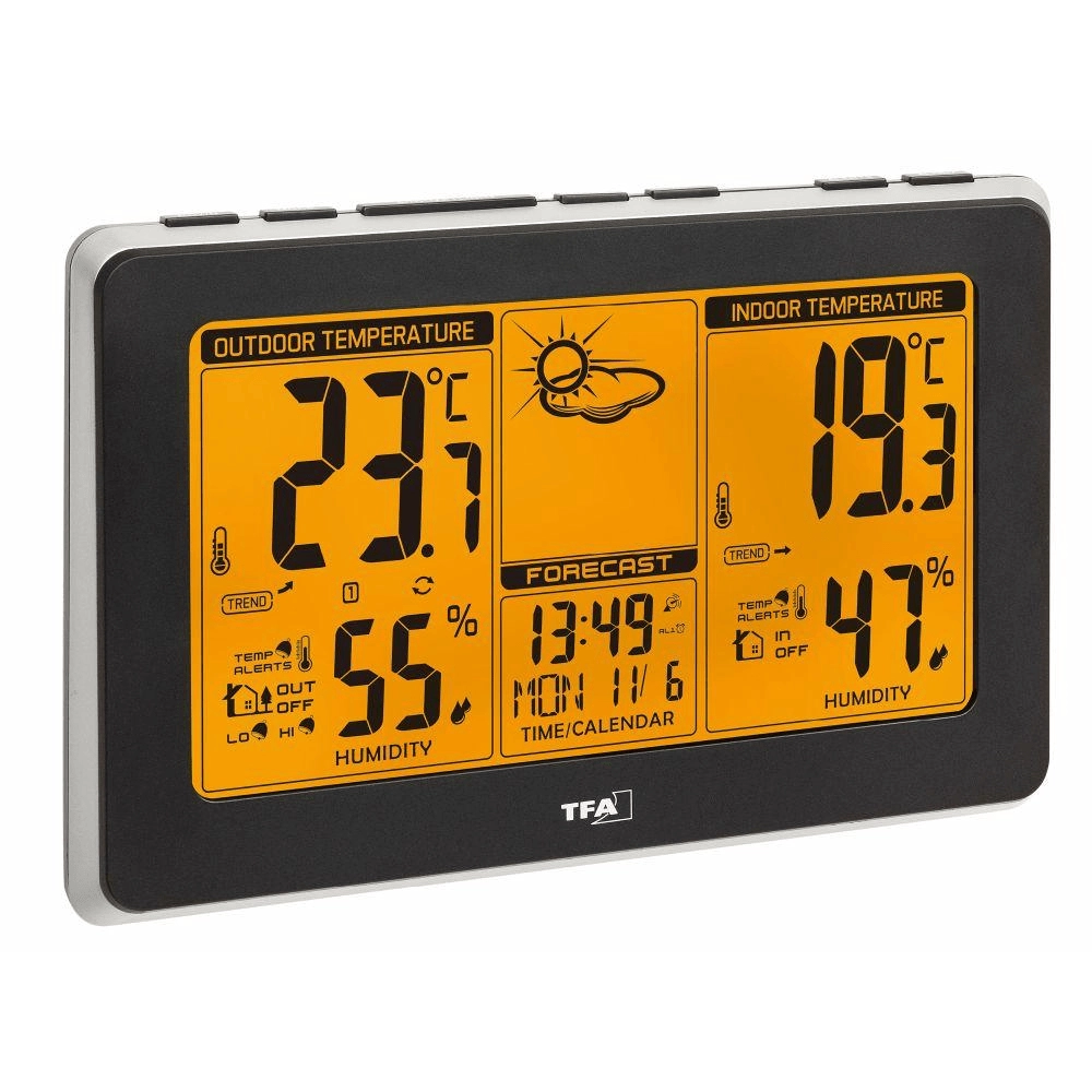 Brezžični senzor prenaša temperaturo in vlažnost do 60 m (na odprtem prostoru), sistem pa je mogoče razširiti do 3 senzorjev za več lokacij. Postaja nudi temperaturni alarm, indikatorje trenda temperature, koledar z dnem v tednu (7 jezikov) in dve budilki s funkcijo SNOOZE. Osvetlitev zaslona ima 2 stopnji svetlosti in jo je mogoče neprekinjeno napajati z adapterjem.