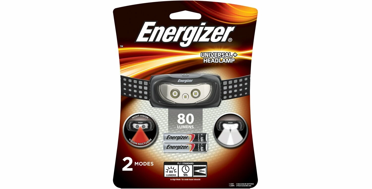 Lahka in vzdržljiva naglavna svetilka Energizer Universal Plus ponuja svetlobni tok 80 lm, doseg do 40 m ter rdeče LED za nočni vid in opozorilo. Zahvaljujoč nastavljivemu elastičnemu traku in možnosti usmerjanja snopa svetlobe je idealna za tek, kolesarjenje, pohodništvo in kampiranje. Napajanje zagotavljata običajno dostopni 2× AAA bateriji.