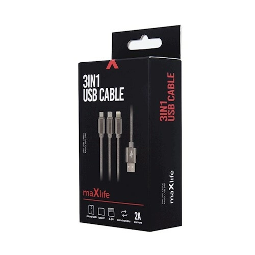 Univerzalen kabel Maxlife 3‑v‑1 v vzdržljivem najlonskem pletenju ponuja tri priključke – Lightning, USB‑C in microUSB – za polnjenje več naprav z enim kablom. Podpira hitro polnjenje 2,1 A, je prožen in zahvaljujoč kovinskim zaključkom izjemno trpežen.