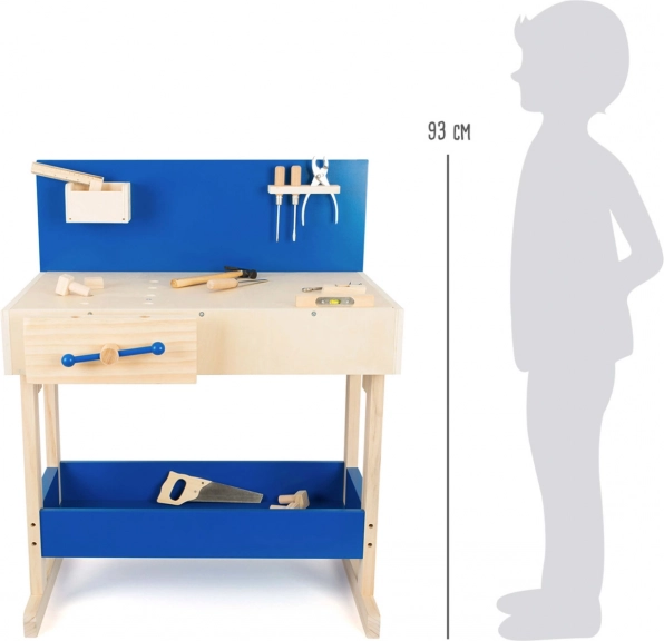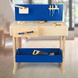 Lesena delovna miza ponuja otrokom možnost posnemanja pravega dela z orodjem in razvija njihovo fino motoriko ter domišljijo. Miza je opremljena z različnimi orodji, kot so žaga in kladivo.