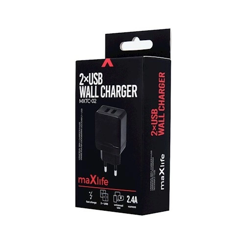 Univerzalni omrežni polnilec MAXLIFE z dvema USB-priključkoma ponuja hitro polnjenje do 2,4 A in omogoča sočasno polnjenje dveh naprav. Zanesljiva izdelava in kompaktna klasična zasnova sta idealni za telefone, slušalke, zvočnike in drugo manjšo elektroniko.