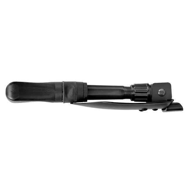 V zloženem stanju meri le 23 cm, zato se brez težav prilega v nahrbtnik ali predal v avtomobilu. Vgrajeno kladivo na koncu ročaja je praktično pri postavitvi tabora – posebej za zabijanje šotornih klinov. Priloženi najlonski etui ščiti orodje in olajša prenašanje.