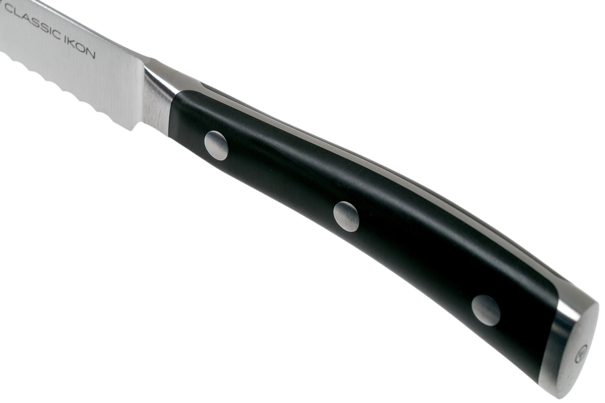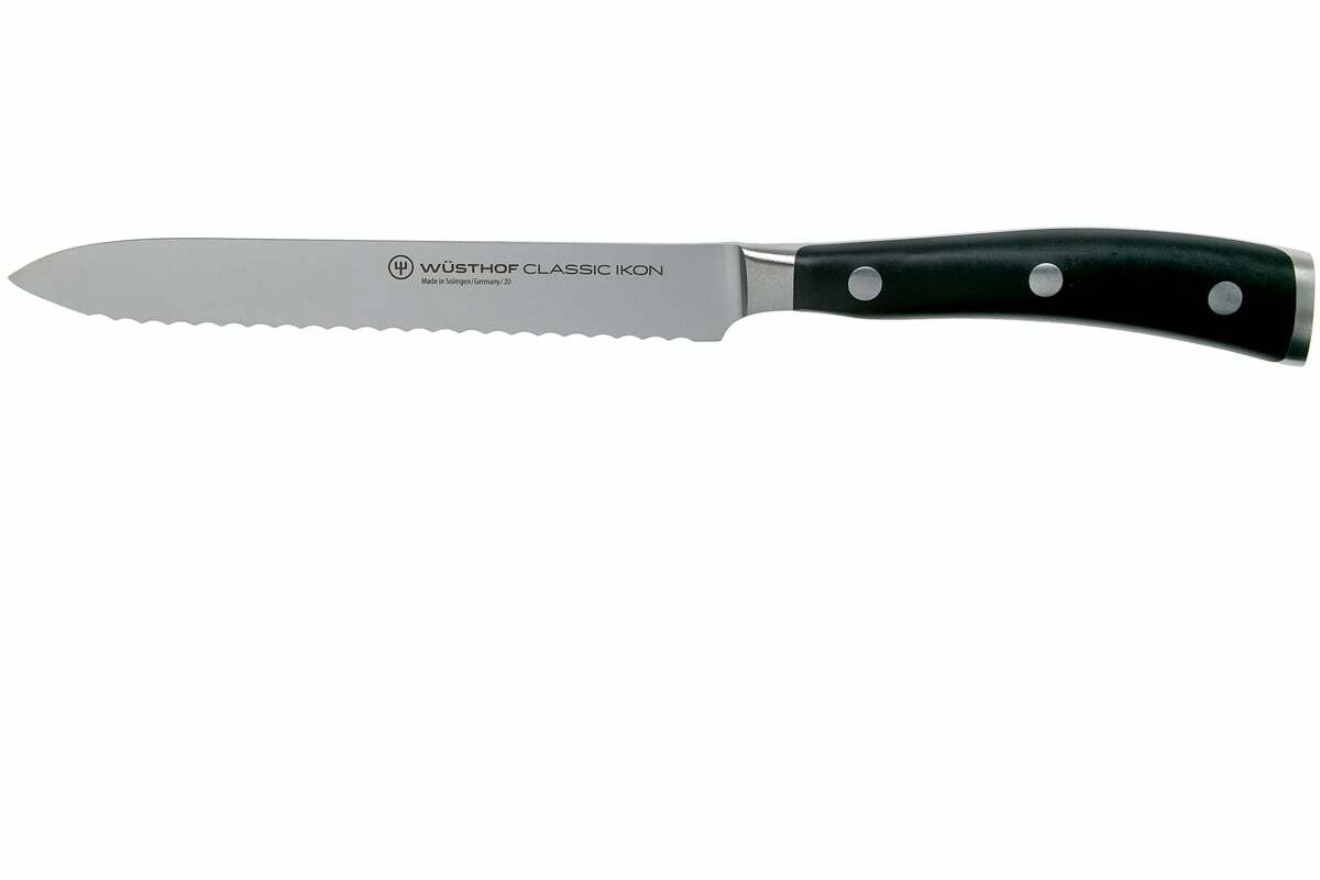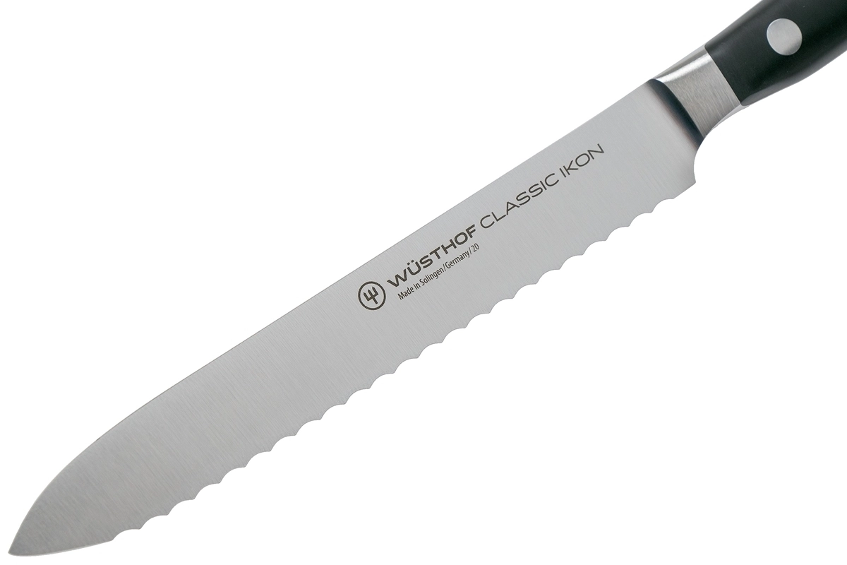 Univerzalni nazobčani nož Wüsthof CLASSIC IKON dolžine 14 cm je natančno tisti pomočnik, po katerem posežete vsak dan. Nazobčano rezilo se zanesljivo ujeda v trše površine in gladko zdrsne skozi hrustljavo skorjo bagete, kožico paradižnika ter sočen melon. Zahvaljujoč uravnoteženi zasnovi s polnim tangom imate nad rezanjem odličen nadzor.
