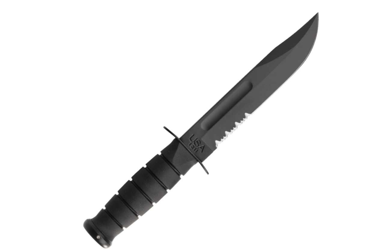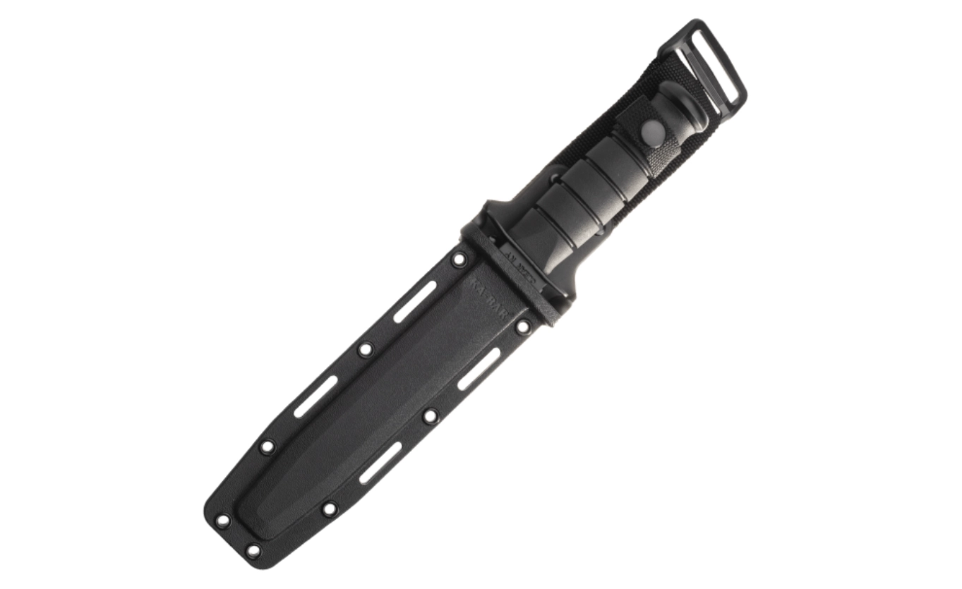 Taktični nož KA-BAR, navdihnjen z legendarnimi modeli U.S.M.C., ponuja fiksno rezilo 17,9 cm iz jekla 1095 Cro-Van z delno nazobčanim rezilnim robom in črnim zaščitnim premazom. Proti zdrsu oblikovan ročaj iz Kratona zagotavlja zanesljiv oprijem, v kompletu pa je tudi trpežna Kydex nožnica.