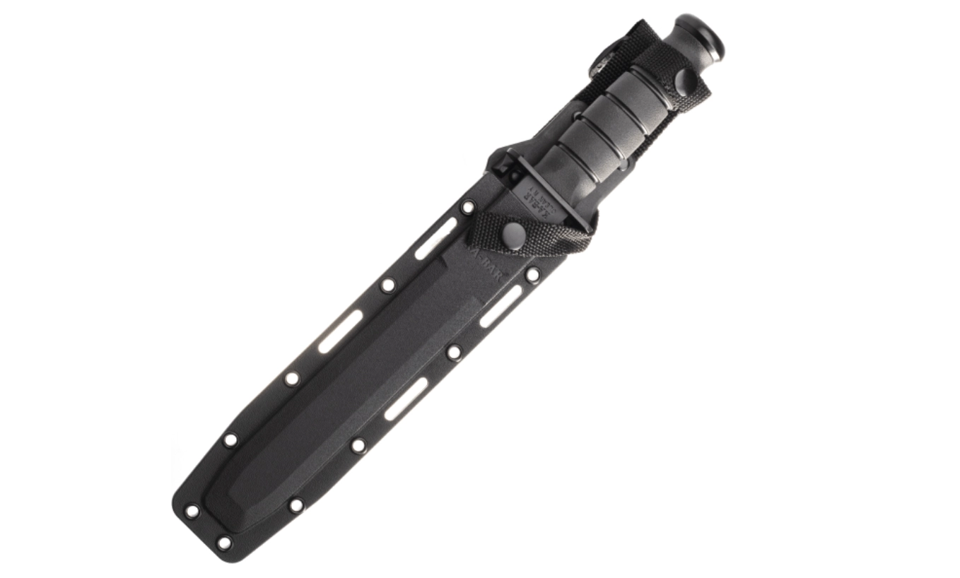 Ta taktični nož temelji na legendarnem vzorcu U.S.M.C. KA-BAR in je zasnovan za zanesljivo delovanje v zahtevnih pogojih. Rezilo tipa Tanto s črnim premazom nudi odlično penetracijo in trpežnost konice, medtem ko delno nazobčan rob učinkovito reže vrvi, trakove in grobejše materiale. Ergonomični ročaj iz Kratona zagotavlja siguren, nedrseč oprijem tudi v mokrem okolju.