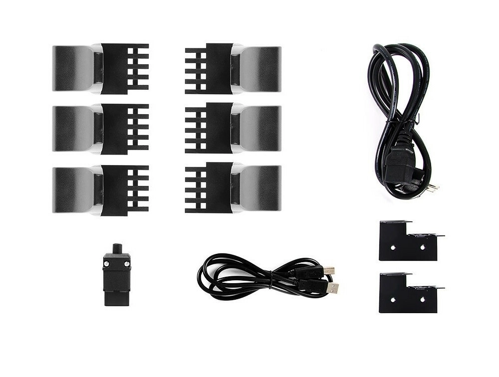 V kompletu so montažni nosilci, držala in kabli za hitro namestitev v omaro ter udobno povezovanje prek USB/RS‑232.