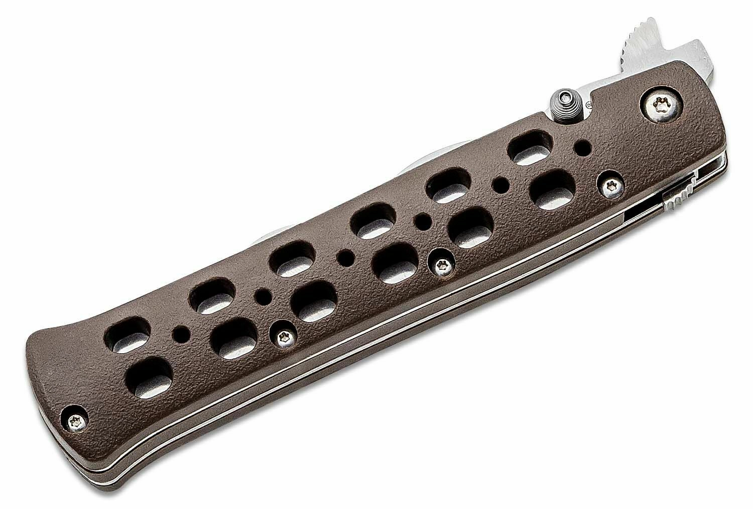 Rezilo iz japonskega nerjavnega jekla AUS-10A s satenastim brušenjem nudi odličen kompromis med ostrino, žilavostjo in odpornostjo proti koroziji. Ogrodje zagotavlja čvrsto vzmetno zaporo Cold Steel z deklarirano nosilnostjo do približno 66 kg, zato lahko računate na varnost pri zahtevnih opravilih. Ergonomski rjav ročaj iz Zy-Ex je lahek, trden in prijetno teksturiran za zanesljiv oprijem.