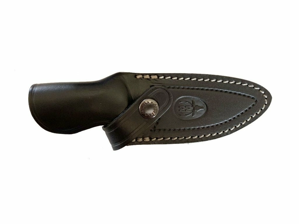 Teksturiran ročaj iz črno‑modre Micarte odlično leži v roki tudi vlažen in nudi zanesljivost pri natančnih rezih ter grobejšem delu. Praktična odprtina za vrvico olajša zavarovanje in nošenje. Del paketa je usnjena nožnica za varno shranjevanje in udobno nošenje na pasu.