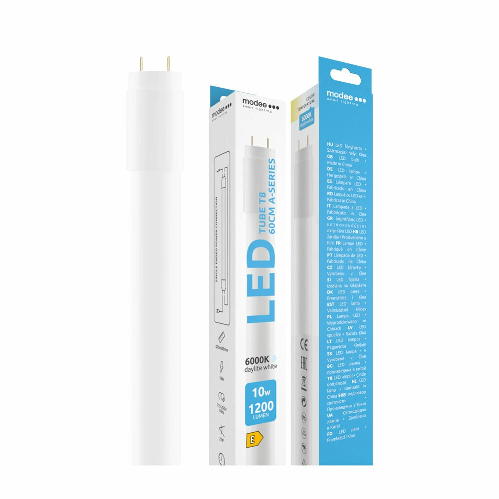 Steklena LED cev T8 blagovne znamke Modee Smart Lighting ponuja varčno osvetlitev z močjo 10 W in svetilnostjo 1200 lm. Oddaja hladno belo svetlobo 6000 K, ki je idealna za delovne prostore, garaže in tehnične prostore. Zahvaljujoč visokemu svetlobnemu toku in nizki porabi zagotavlja enakomerno in zanesljivo osvetlitev.