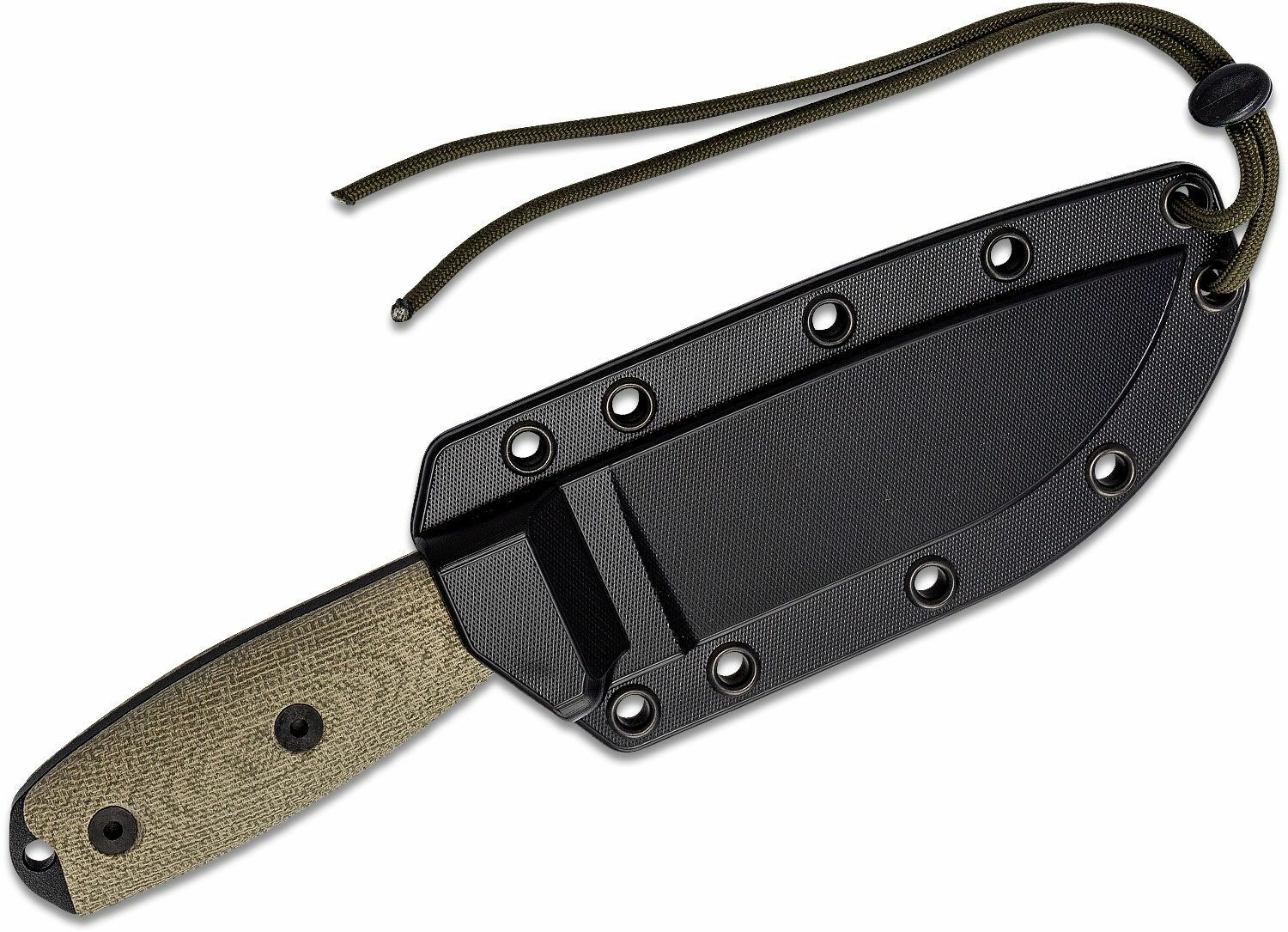 Ročaj iz vzdržljive Micarte s strukturiranim 3D rezkanjem nudi odličen oprijem tudi, ko je moker. Zaradi odprtine za vrvico lahko nož zavarujete s paščkom ali dopolnite s paracordom. Lahko plastično ohišje rezila olajša varno nošenje in hiter dostop do orodja.