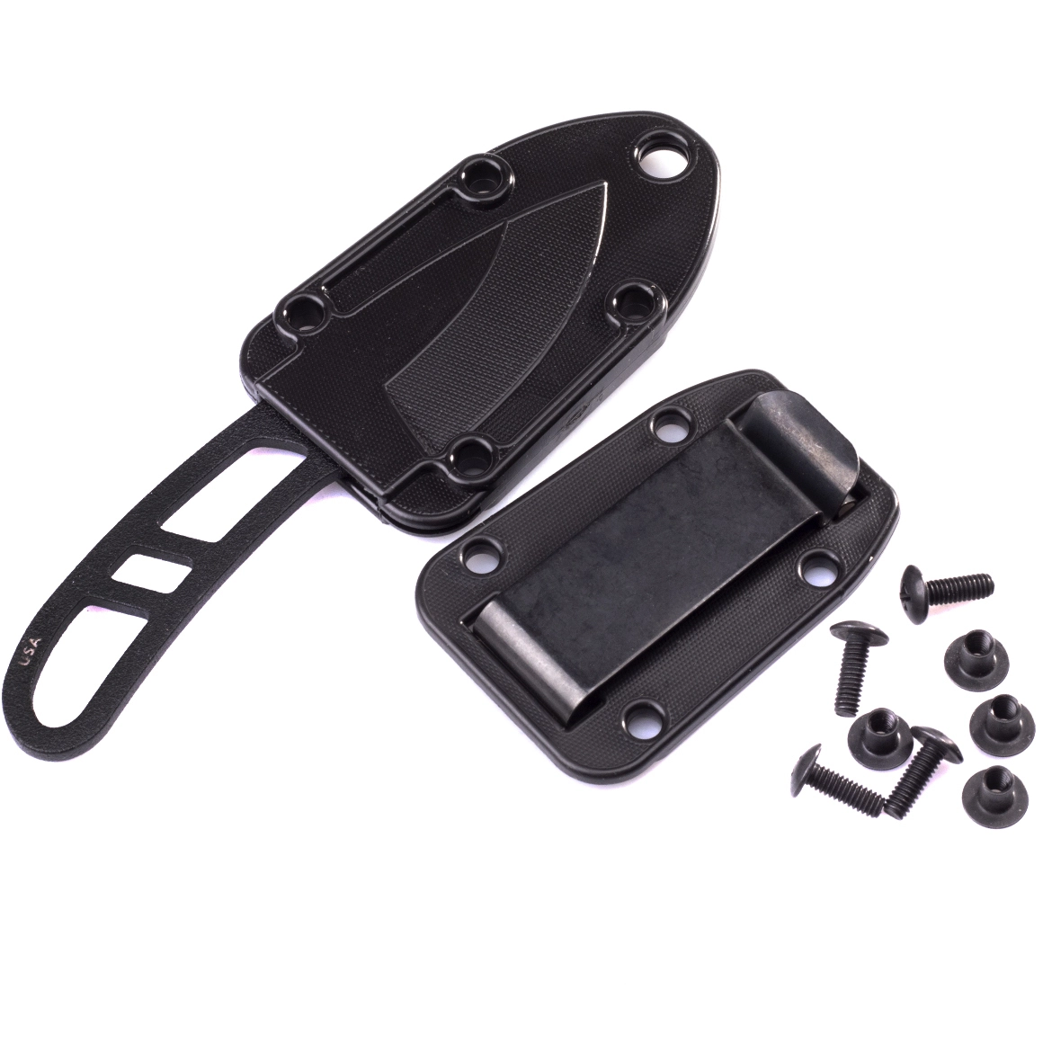 Oblikovan tok z več odprtinami omogoča obešanje na vrvico, montažo na pas ali pritrditev na nahrbtnik. Varno fiksira nož in ščiti rezilo med prenašanjem.