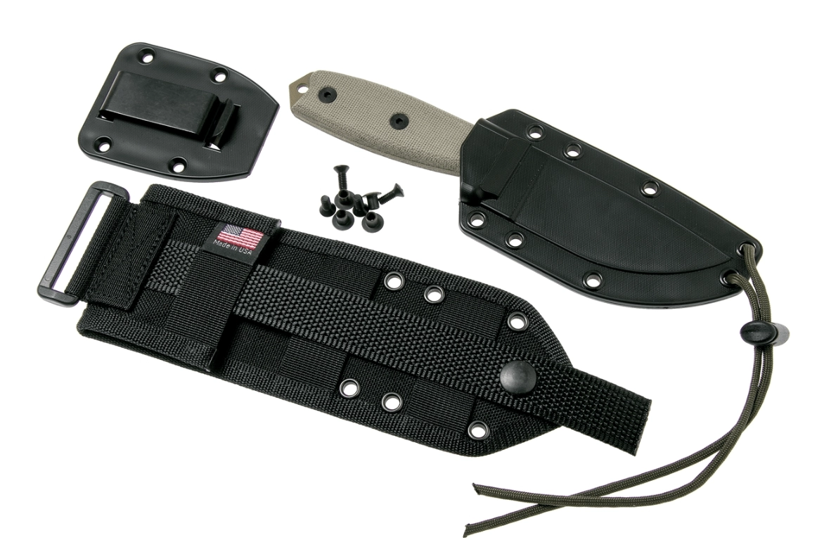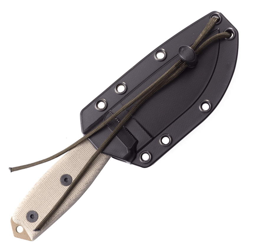 Ergonomski ročaj iz materiala Micarta z grobejšo teksturo nudi zanesljiv oprijem tudi moker. Polna tang konstrukcija zagotavlja visoko trdnost, izrazita zaščita ščiti prste, odprtina za vrvico pa olajša varovalno pritrditev ali obešanje. Del paketa je lahka, a trdna nožnica Zytel z več možnostmi nošenja – na pas s pomočjo jeklenega sponka ali na opremo prek združljivega sistema MOLLE.