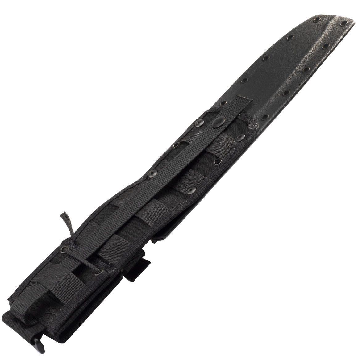 Vzdržljiva Kydex nožnica z večtočkovnim zavarovanjem in združljivostjo z MOLLE omogoča varno nošenje na pasu ali opremi ter hitro izvleko.