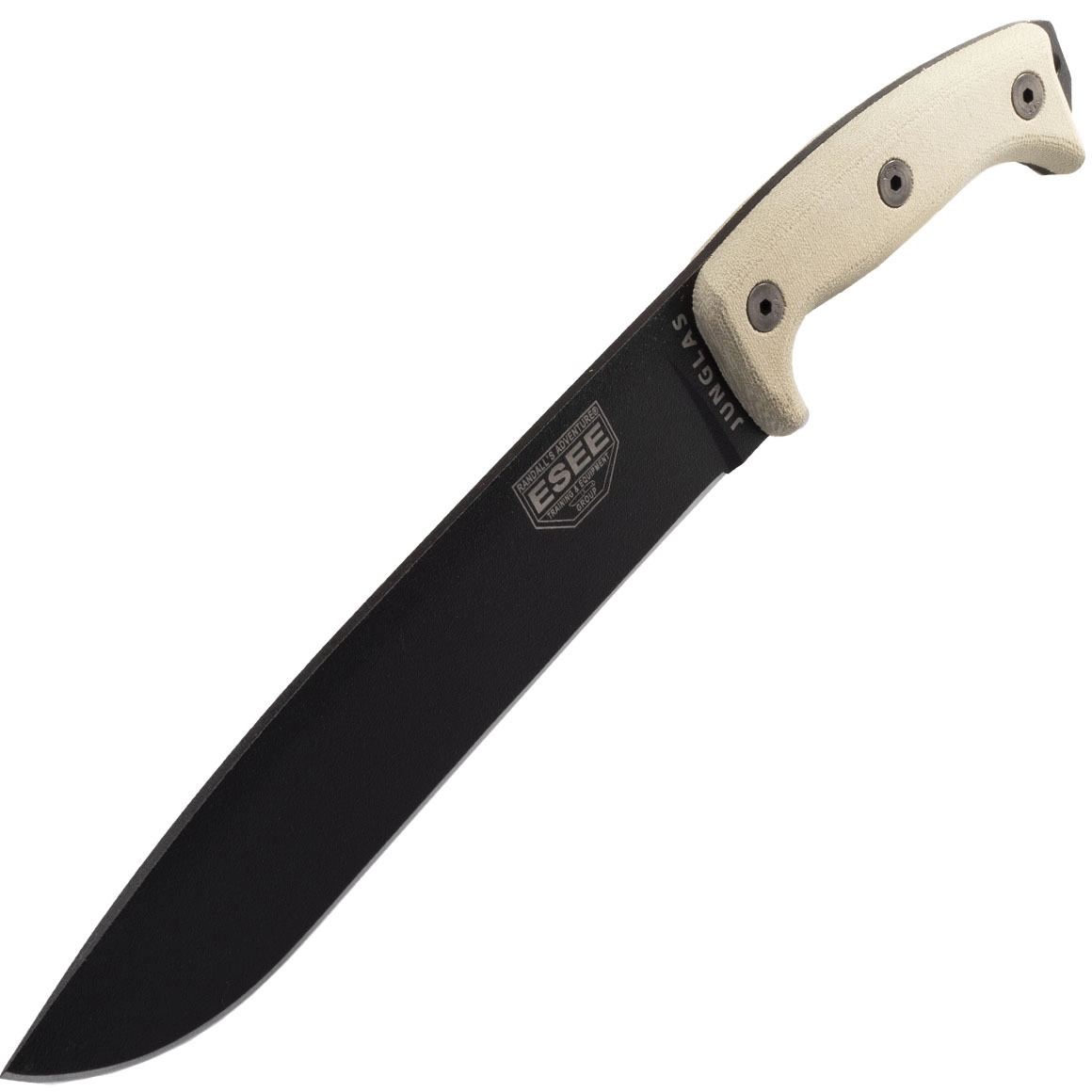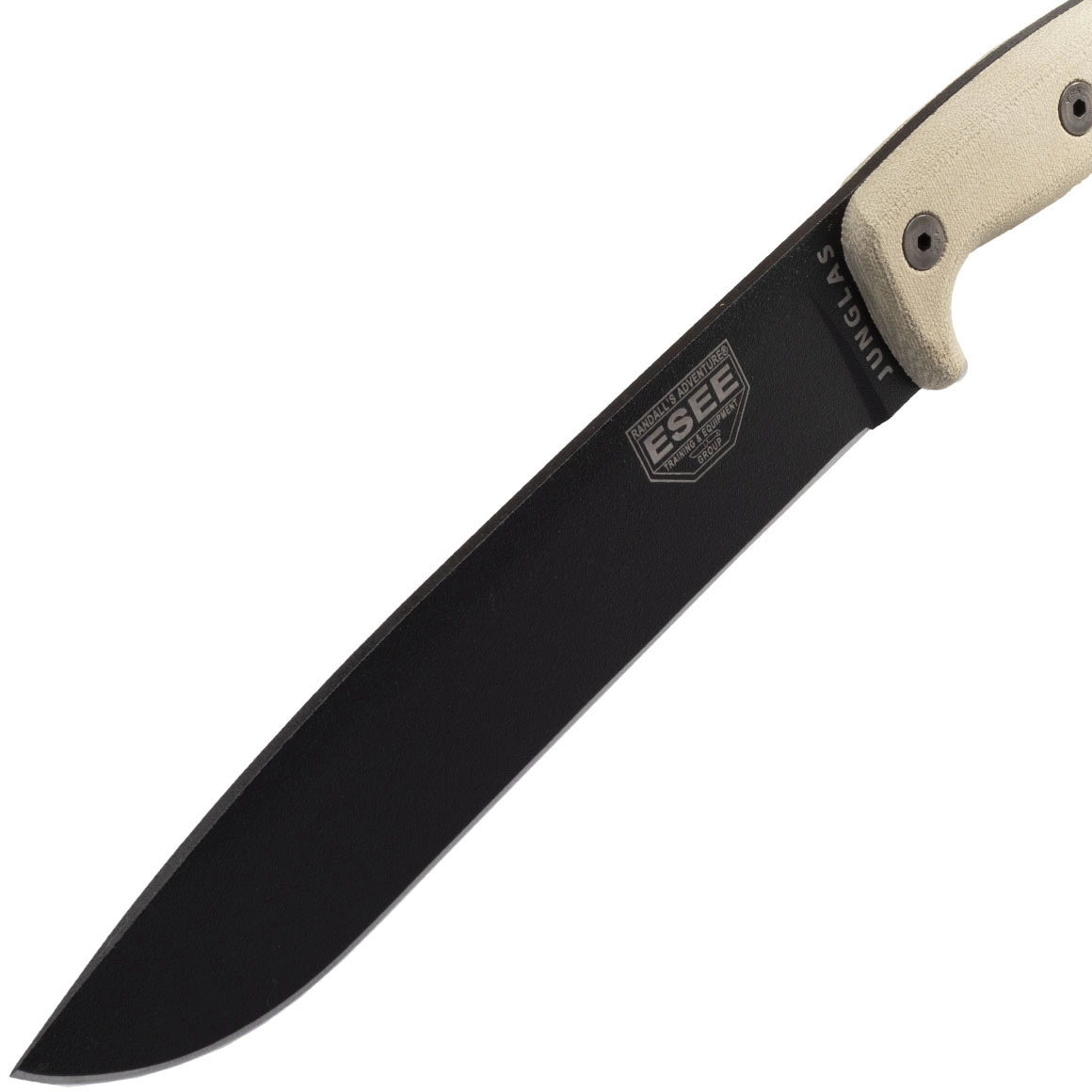 Mačeta ESEE JUNGLAS-E je orodje za avanturiste, bushcrafterje in profesionalce. Močno rezilo iz ogljikovega jekla 1095 s črno površinsko obdelavo odlično reže, seka in prebija vegetacijo. Zahvaljujoč full-tang konstrukciji je izjemno trpežna in zanesljiva tudi pri težkem delu. Ročaj iz materiala Micarta v peščeno rjavem odtenku odlično sede v roko, ne drsi, na koncu pa ponuja odprtino za vrvico in praktično glavico za rahlo potolkanje.