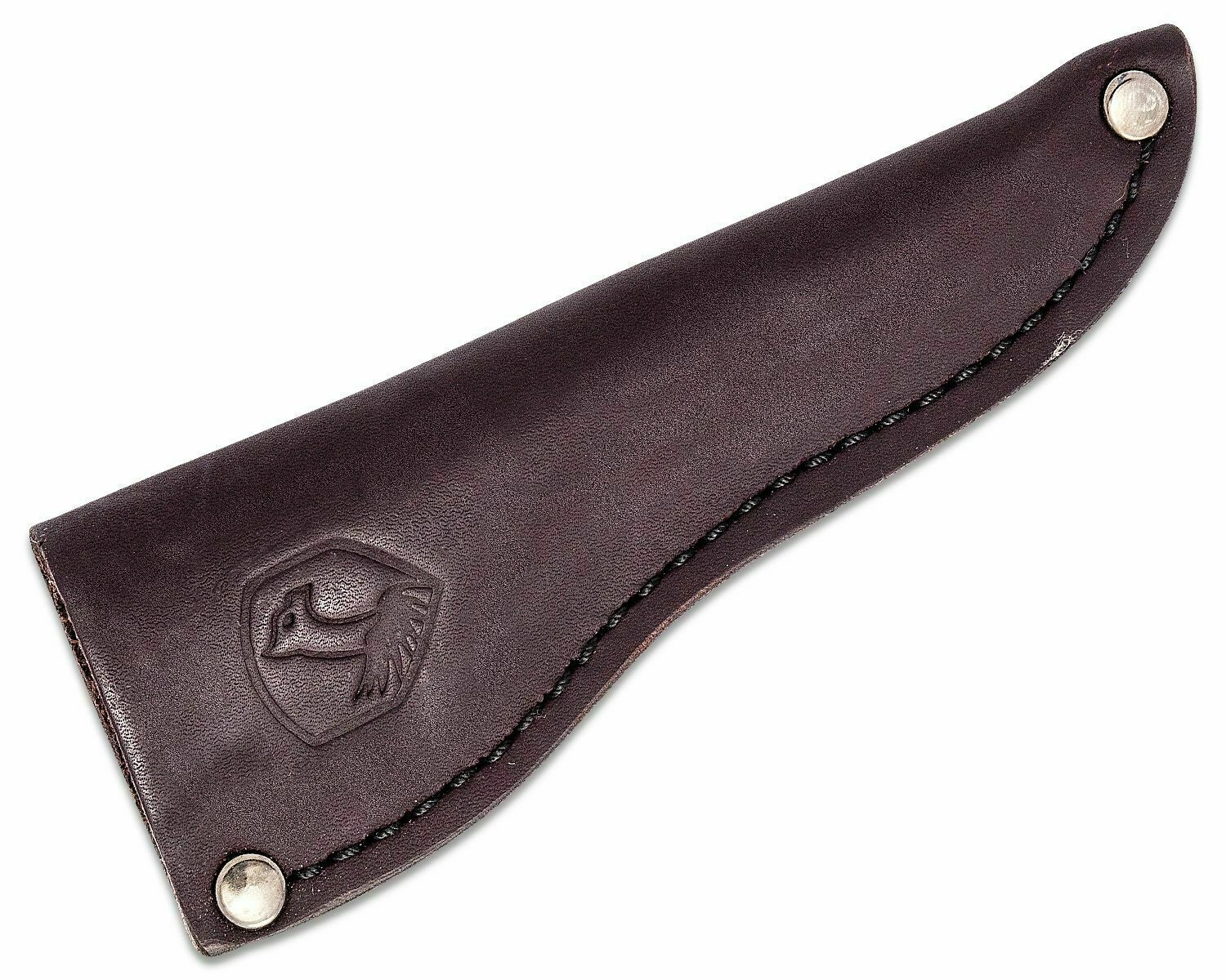 Temno usnjeno etui s čvrstim šivom in zakovicami ščiti rezilo ter omogoča varno nošenje na pasu.