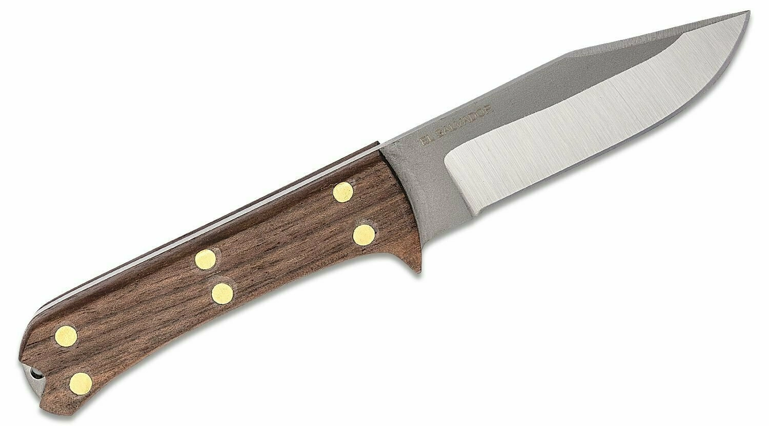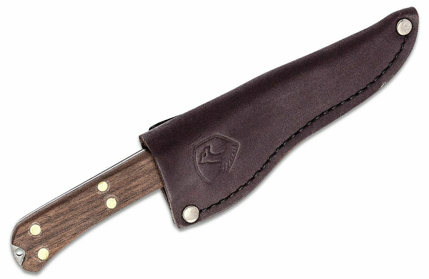 Ročaj iz kakovostnega orehovega lesa zanesljivo sede v roko in nudi varen oprijem tudi pri zahtevnejšem delu. Na koncu ročaja je odprtina za napeljavo vrvice ali zanke. K nožu prejmete tudi temno usnjeno etui z robustnim prešitjem in zakovicami, ki ščiti rezilo in omogoča udobno nošenje na pasu.