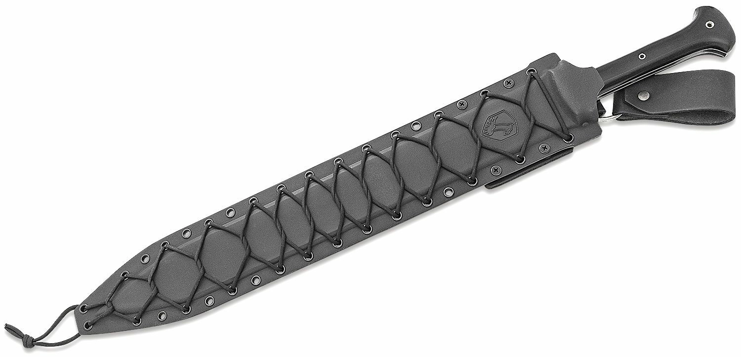 Rezilo iz ogljičnega jekla 1075 z črnim prašnim premazom je obojestransko brušeno ter nudi odličen vbod in rez. Konstrukcija full-tang zagotavlja visoko odpornost pri zahtevni rabi, medtem ko ročaj iz Micarte ponuja zanesljiv oprijem tudi v mokrem. Priložena je Kydex nožnica s paracord prepletom za prilagodljivo pritrjevanje in varno prenašanje.
