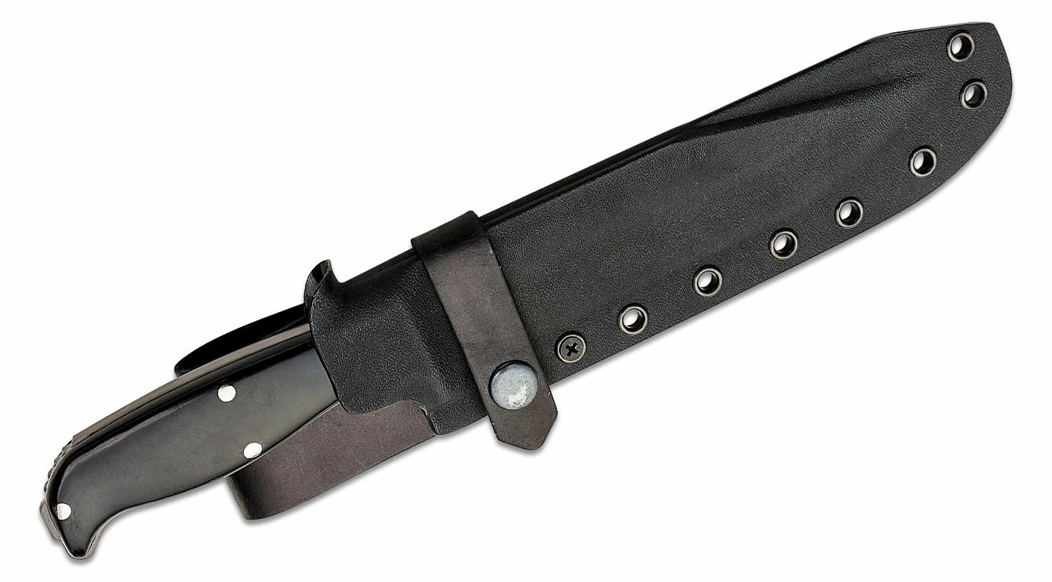 Črn ročaj iz micarte nudi varen in udoben oprijem tudi v mokrem ali z rokavicami. Integrirana udarna konica na koncu ročaja služi kot sili kladivce. Nož je dobavljen z robustno Kydex nožnico z usnjenim paščkom za več možnosti nošenja.