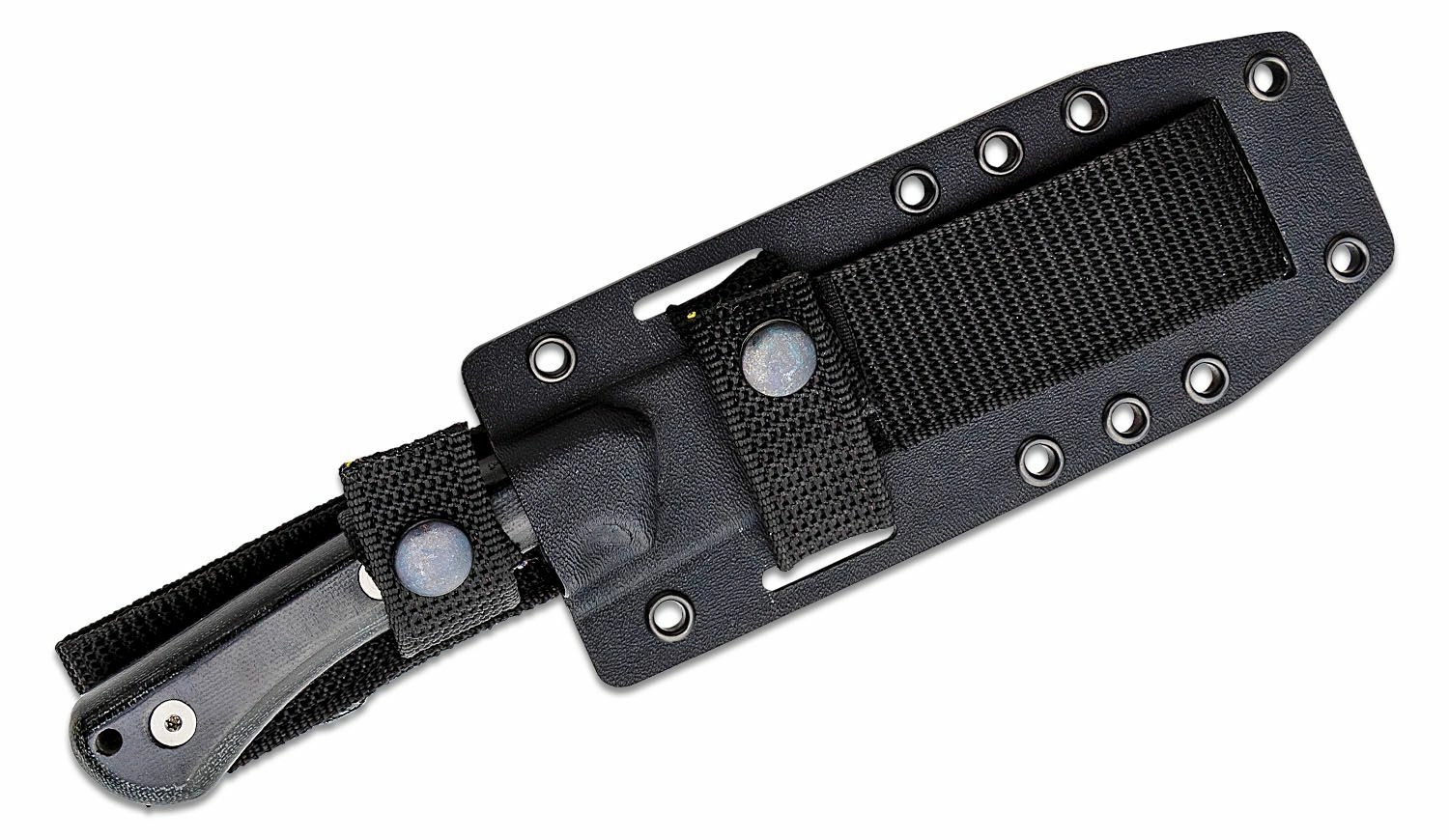Ergonomsko oblikovan ročaj iz materiala Micarta v črni barvi zagotavlja zanesljiv oprijem tudi v zahtevnih razmerah. V peti ročaja je praktična odprtina za vrvico ali obesek. Del paketa je robusten tok Kydex, ki je združljiv s sistemom MOLLE za prilagodljivo nošenje na opremi.