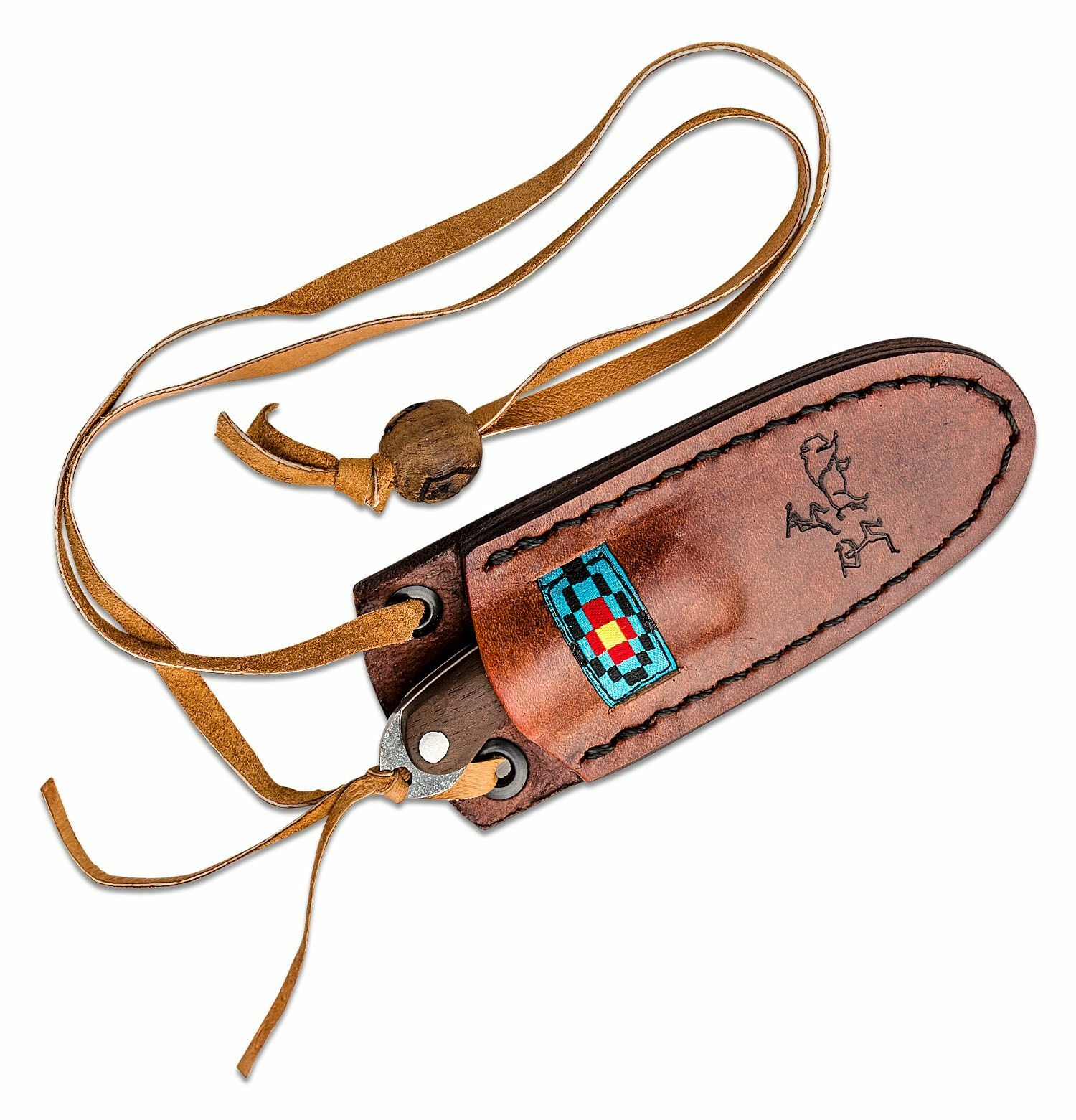 Ročaj iz orehovega lesa, dopolnjen s turkiznim kamnom, nudi udoben in zanesljiv oprijem tudi v neugodnih razmerah. Nož je dobavljen z usnjeno nožnico, okrašeno z motivom lova, ter s trakom, ki omogoča varno in elegantno nošenje okoli vratu.