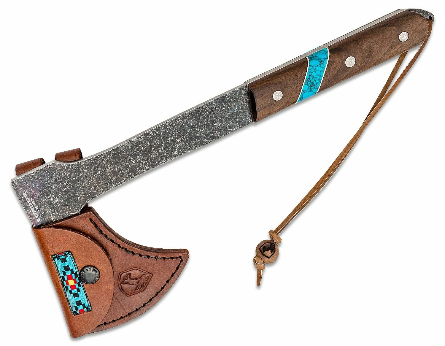 Lahek in trpežen tomahawk za bivanje v naravi. Glava iz ogljikovega jekla 1075 z naravno površinsko obdelavo, prehodna full-tang konstrukcija in ergonomski ročaj iz orehovega lesa z elementi turkiznega kamna. V kompletu je kakovosten usnjen etui. Odličen za kampiranje, bushcraft in druge aktivnosti na prostem. Ogljikovo jeklo 1075, full-tang konstrukcija, orehov les, usnjen etui v kompletu.