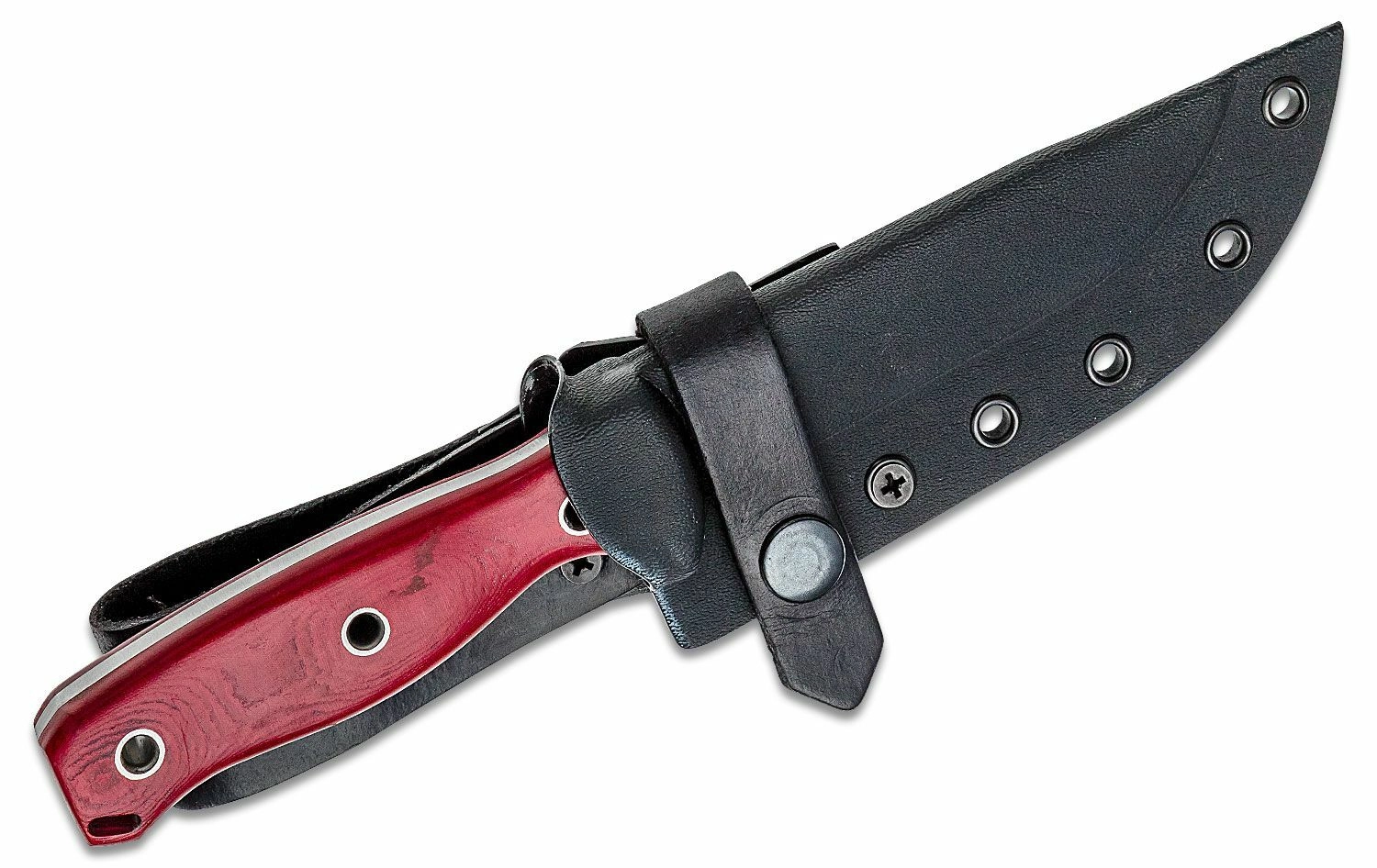Ročaj iz 3D rezkane rdeče Micarte je trdno pritrjen s tremi votlimi zakovicami in nudi odličen oprijem tudi v mokrem. Izrazite opore za palec na hrbtu ročaja dajejo zanesljivost pri natančnih, zahtevnih opravilih. Del paketa je trpežen tok iz Kydexa, dopolnjen z usnjenimi elementi za udobno in varno nošenje na terenu.