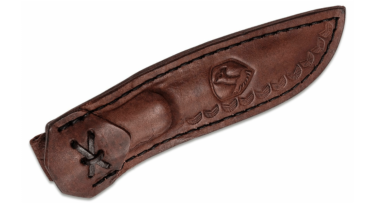 Ročaj iz kakovostnega orehovega lesa je pritrjen s tremi medeninastimi kovicami in okrašen z medeninasto žico, kar prispeva k estetiki in stabilnosti oprijema. Ročno izdelano usnjeno tokovje omogoča udobno in varno nošenje na pasu, da imate nož vedno pri roki.