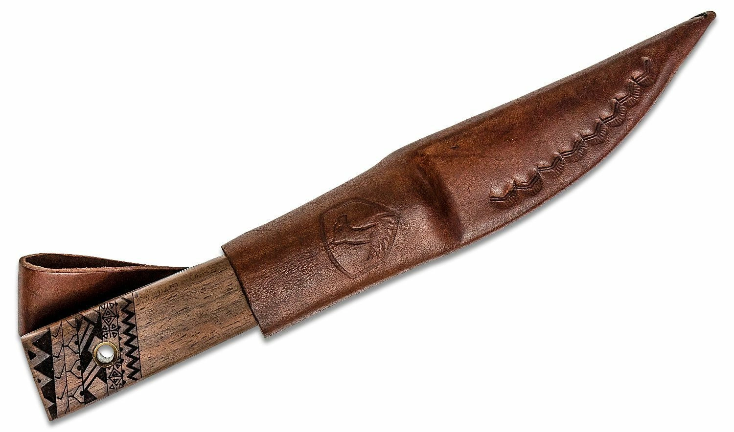 Ročaj iz orehovega lesa odlično sede v roko, medeninasto navitje pa ne le doda privlačen videz, temveč tudi varnejši oprijem. Zaključek z izrezljanimi detajli in odprtino za vrvico prispevata k funkcionalnosti in estetiki. Del paketa je kakovosten usnjen etui za varno nošenje na pasu.