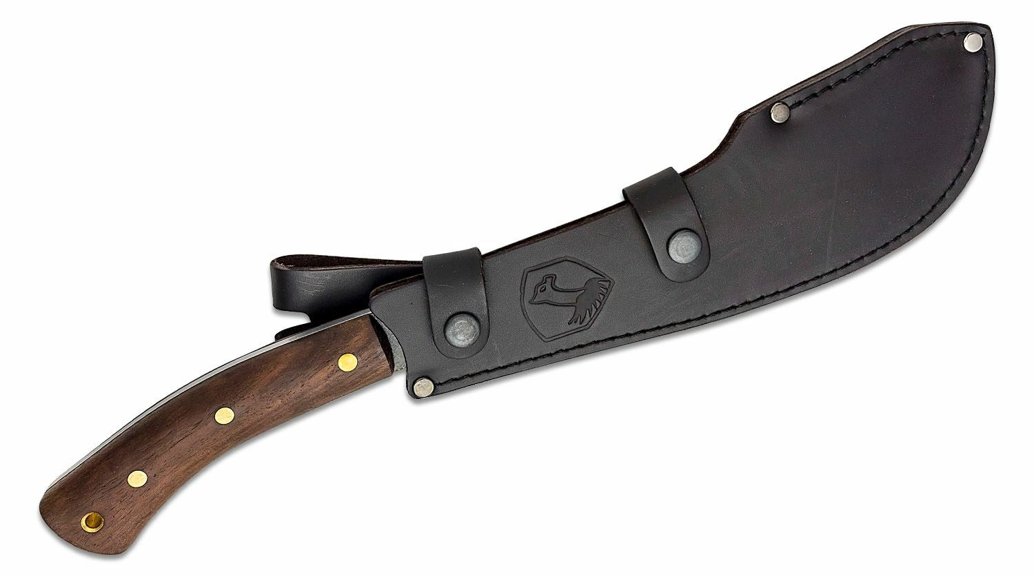 Ergonomski ročaj iz trdega lesa je pritrjen z medeninastimi zakovicami, odprtina za vrvico pa omogoča dodatno zaščito pred zdrsom iz roke. Priložena je kakovostna usnjena nožnica, ki ščiti rezilo in omogoča udobno nošenje med izleti v naravo.