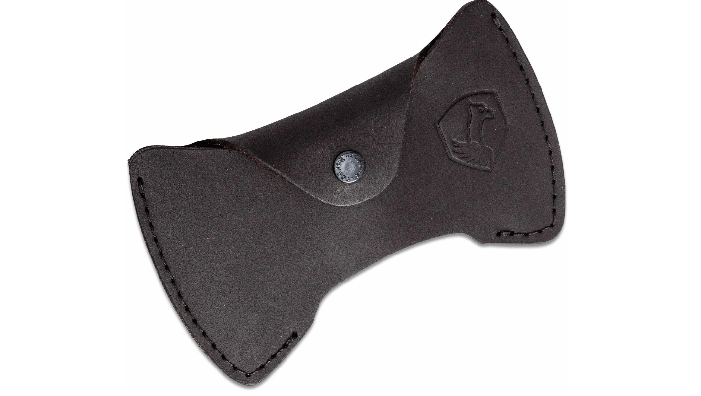 Ročaj iz ameriškega hikorija z razširitvijo na koncu zagotavlja zanesljiv oprijem in boljši nadzor nad zamahom. Praktična odprtina v ročaju omogoča napeljavo vrvice za obešanje ali dodatno zavarovanje. Priloženi ročno izdelani usnjeni etui ščiti rezilo med shranjevanjem in prenašanjem.