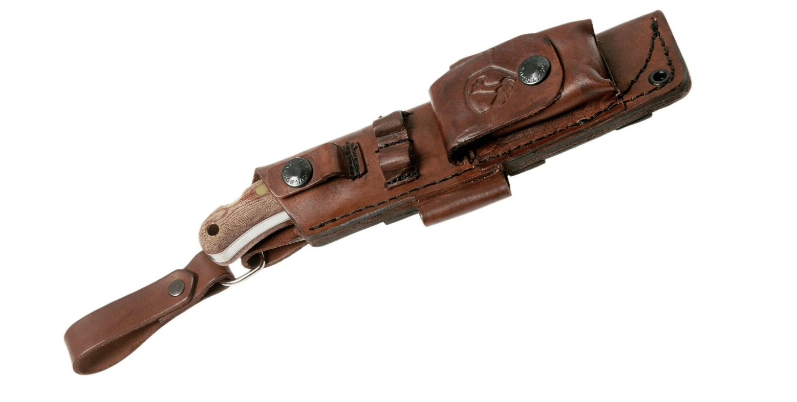 Rjava micarta zagotavlja zanesljiv oprijem tudi v mokrem, njeni integrirani elementi pa funkcionalnost še razširijo: dvojica izrezov olajša uporabo kresila, vgrajena vdolbina v ročaju pa podpira prižiganje ognja z “vrtalnim lokom”. Nož dopolnjujejo usnjene nožnice z žepi in priloženo kresilo za hitro zanetenje ognja na terenu.